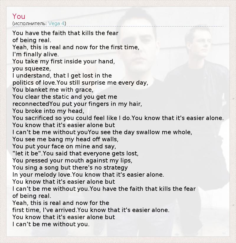 You have the faith that kills the fear of being real. Yeah, this is real and now for the first time, I'm finally alive. You take my first inside your hand, you squeeze, I understand, that I get lost in the politics of love.You still surprise me every day, You blanket me with grace, You clear the static and you get me reconnectedYou put your fingers in my hair, You broke into my head, You sacrificed so you could feel like I do.You know that it's easier alone. You know that it's easier alone but I can't be me without youYou see the day swallow me whole, You see me bang my head off walls, You put your face on mine and say, "let it be".You said that everyone gets lost, You pressed your mouth against my lips, You sing a song but there's no strategy In your melody love.You know that it's easier alone. You know that it's easier alone but I can't be me without you.You have the faith that kills the fear of being real. Yeah, this is real and now for the first time, I've arrived.You know that it's easier alone. You know that it's easier alone but I can't be me without you.
