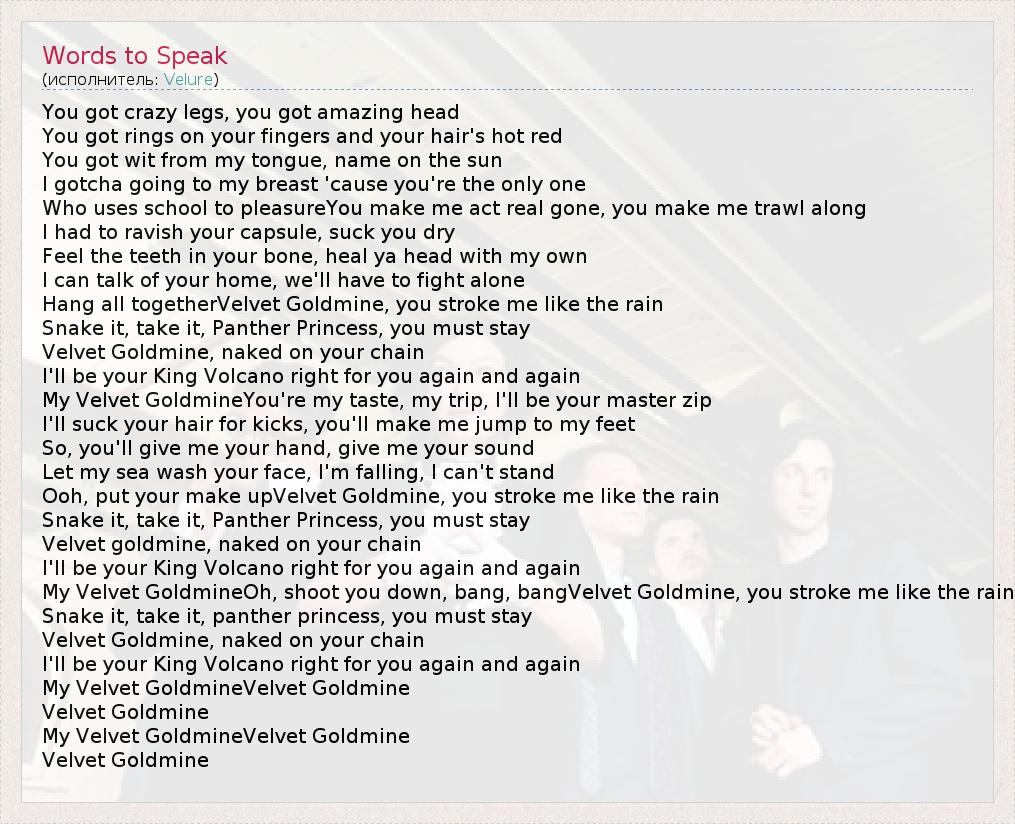 My Velvet GoldmineOh, shoot you down, bang, bangVelvet Goldmine, you stroke me like the rain