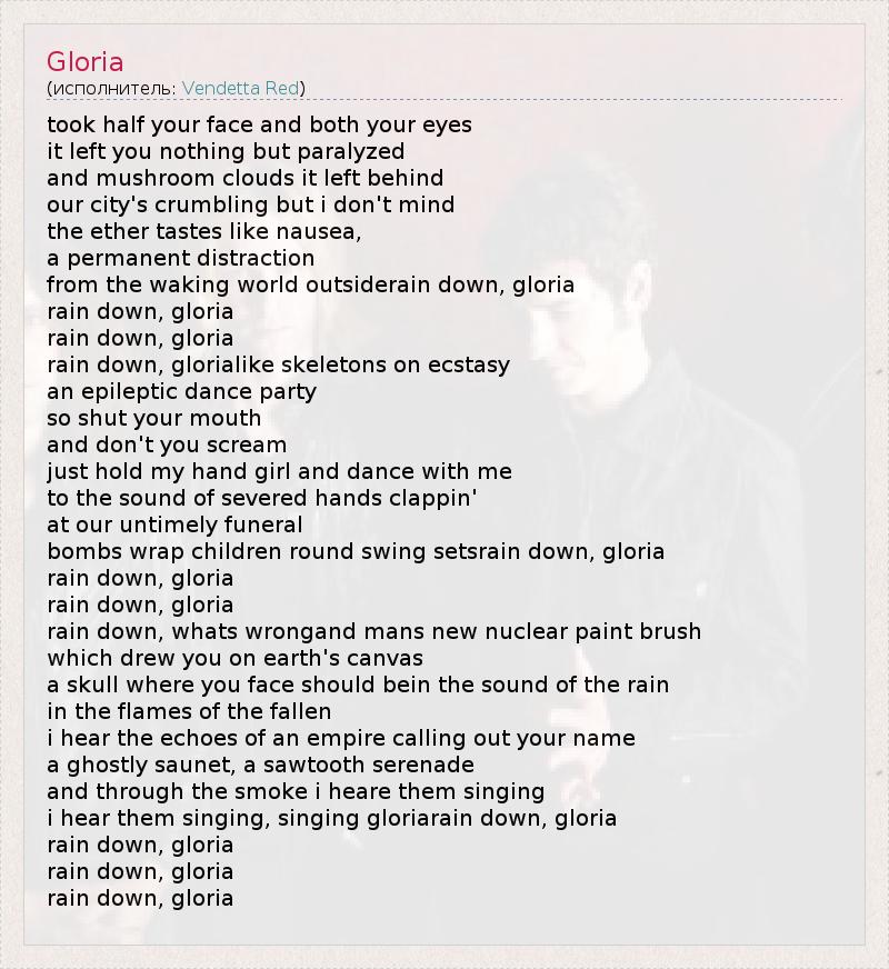 took half your face and both your eyes it left you nothing but paralyzed and mushroom clouds it left behind our city's crumbling but i don't mind the ether tastes like nausea, a permanent distraction from the waking world outsiderain down, gloria rain down, gloria rain down, gloria rain down, glorialike skeletons on ecstasy an epileptic dance party so shut your mouth and don't you scream just hold my hand girl and dance with me to the sound of severed hands clappin' at our untimely funeral bombs wrap children round swing setsrain down, gloria rain down, gloria rain down, gloria rain down, whats wrongand mans new nuclear paint brush which drew you on earth's canvas a skull where you face should bein the sound of the rain in the flames of the fallen i hear the echoes of an empire calling out your name a ghostly saunet, a sawtooth serenade and through the smoke i heare them singing i hear them singing, singing gloriarain down, gloria rain down, gloria rain down, gloria rain down, gloria