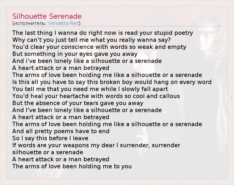 The last thing I wanna do right now is read your stupid poetry Why can't you just tell me what you really wanna say? You'd clear your conscience with words so weak and empty But something in your eyes gave you away And i've been lonely like a silhouette or a serenade A heart attack or a man betrayed The arms of love been holding me like a silhouette or a serenade Is this all you have to say this broken boy would hang on every word You tell me that you need me while I slowly fall apart You'd heal your heartache with words so cool and callous But the absence of your tears gave you away And I've been lonely like a silhouette or a serenade A heart attack or a man betrayed The arms of love been holding me like a silhouette or a serenade And all pretty poems have to end So I say this before I leave If words are your weapons my dear I surrender, surrender silhouette or a serenade A heart attack or a man betrayed The arms of love been holding me to you