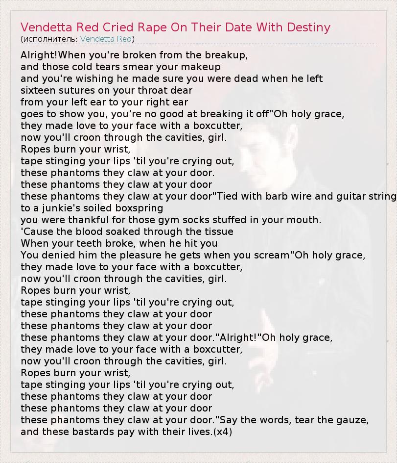 А как ты думаешь, о чем песня "Vendetta Red Cried Rape On Their Date With Destiny" ?