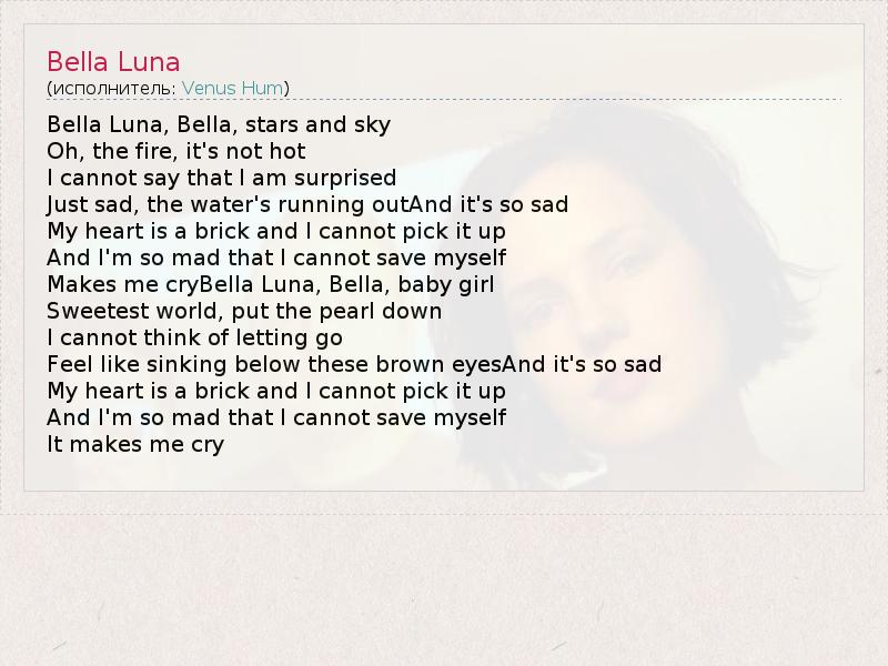 Bella Luna, Bella, stars and sky Oh, the fire, it's not hot I cannot say that I am surprised Just sad, the water's running outAnd it's so sad My heart is a brick and I cannot pick it up And I'm so mad that I cannot save myself Makes me cryBella Luna, Bella, baby girl Sweetest world, put the pearl down I cannot think of letting go Feel like sinking below these brown eyesAnd it's so sad My heart is a brick and I cannot pick it up And I'm so mad that I cannot save myself It makes me cry