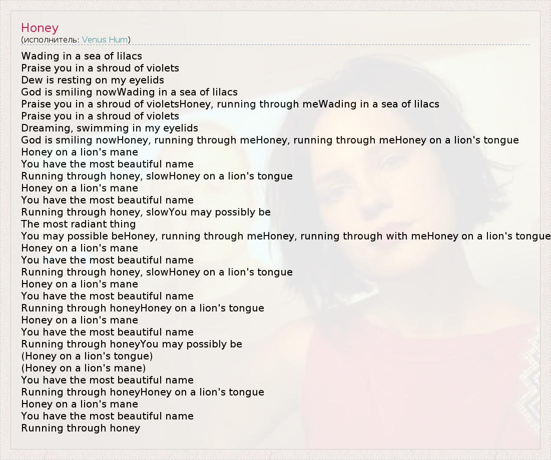 Wading in a sea of lilacs Praise you in a shroud of violets Dew is resting on my eyelids God is smiling nowWading in a sea of lilacs Praise you in a shroud of violetsHoney, running through meWading in a sea of lilacs Praise you in a shroud of violets Dreaming, swimming in my eyelids God is smiling nowHoney, running through meHoney, running through meHoney on a lion's tongue Honey on a lion's mane You have the most beautiful name Running through honey, slowHoney on a lion's tongue Honey on a lion's mane You have the most beautiful name Running through honey, slowYou may possibly be The most radiant thing You may possible beHoney, running through meHoney, running through with meHoney on a lion's tongue Honey on a lion's mane You have the most beautiful name Running through honey, slowHoney on a lion's tongue Honey on a lion's mane You have the most beautiful name Running through honeyHoney on a lion's tongue Honey on a lion's mane You have the most beautiful name Running through honeyYou may possibly be (Honey on a lion's tongue) (Honey on a lion's mane) You have the most beautiful name Running through honeyHoney on a lion's tongue Honey on a lion's mane You have the most beautiful name Running through honey