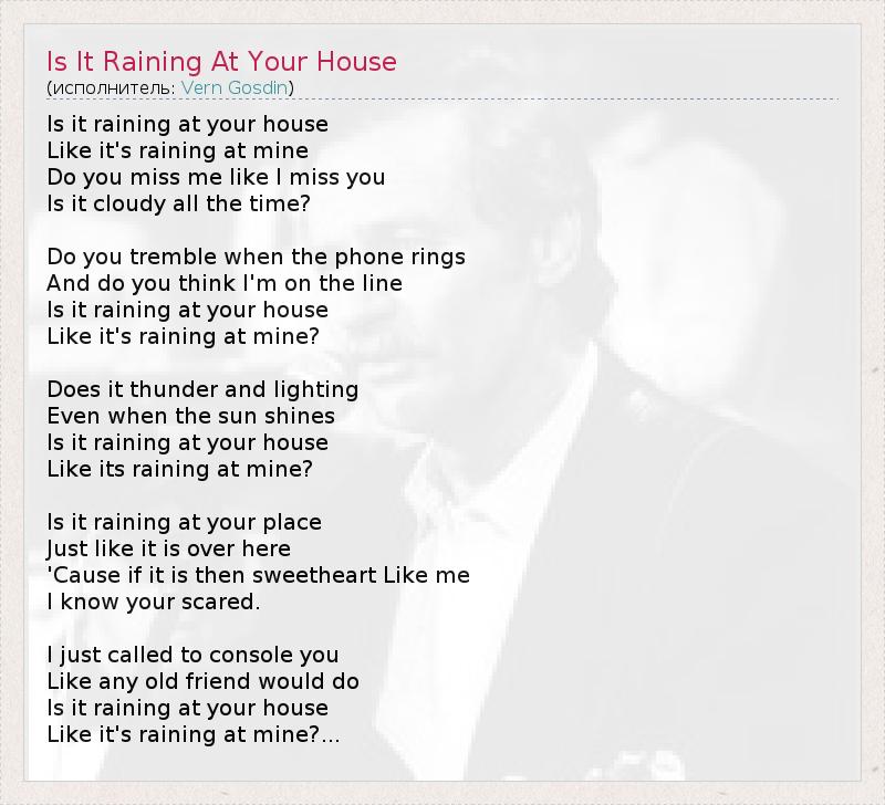 Is it raining at your house Like it's raining at mine Do you miss me like I miss you Is it cloudy all the time? Do you tremble when the phone rings And do you think I'm on the line Is it raining at your house Like it's raining at mine? Does it thunder and lighting Even when the sun shines Is it raining at your house Like its raining at mine? Is it raining at your place Just like it is over here 'Cause if it is then sweetheart Like me I know your scared. I just called to console you Like any old friend would do Is it raining at your house Like it's raining at mine?...