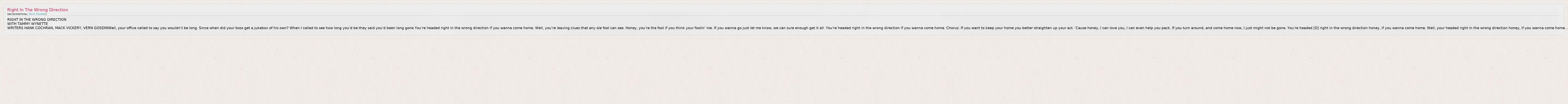 RIGHT IN THE WRONG DIRECTION WITH TAMMY WYNETTE WRITERS HANK COCHRAN, MACK VICKERY, VERN GOSDINWell, your office called to say you wouldn't be long. Since when did your boss get a jukebox of his own? When I called to see how long you'd be they said you'd been long gone You're headed right in the wrong direction if you wanna come home. Well, you're leaving clues that any ole fool can see. Honey, you're the fool if you think your foolin' me. If you wanna go just let me know, we can sure enough get it all. You're headed right in the wrong direction if you wanna come home. Chorus: If you want to keep your home you better straighten up your act. 'Cause honey, I can love you, I can even help you pack. If you turn around, and come home now, I just might not be gone. You're headed [D] right in the wrong direction honey, if you wanna come home. Well, your headed right in the wrong direction honey, if you wanna come home...