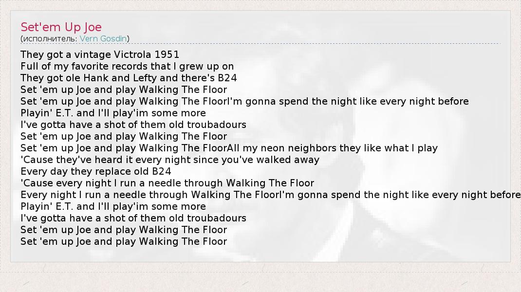 А как ты думаешь, о чем песня "Set'em Up Joe" ?