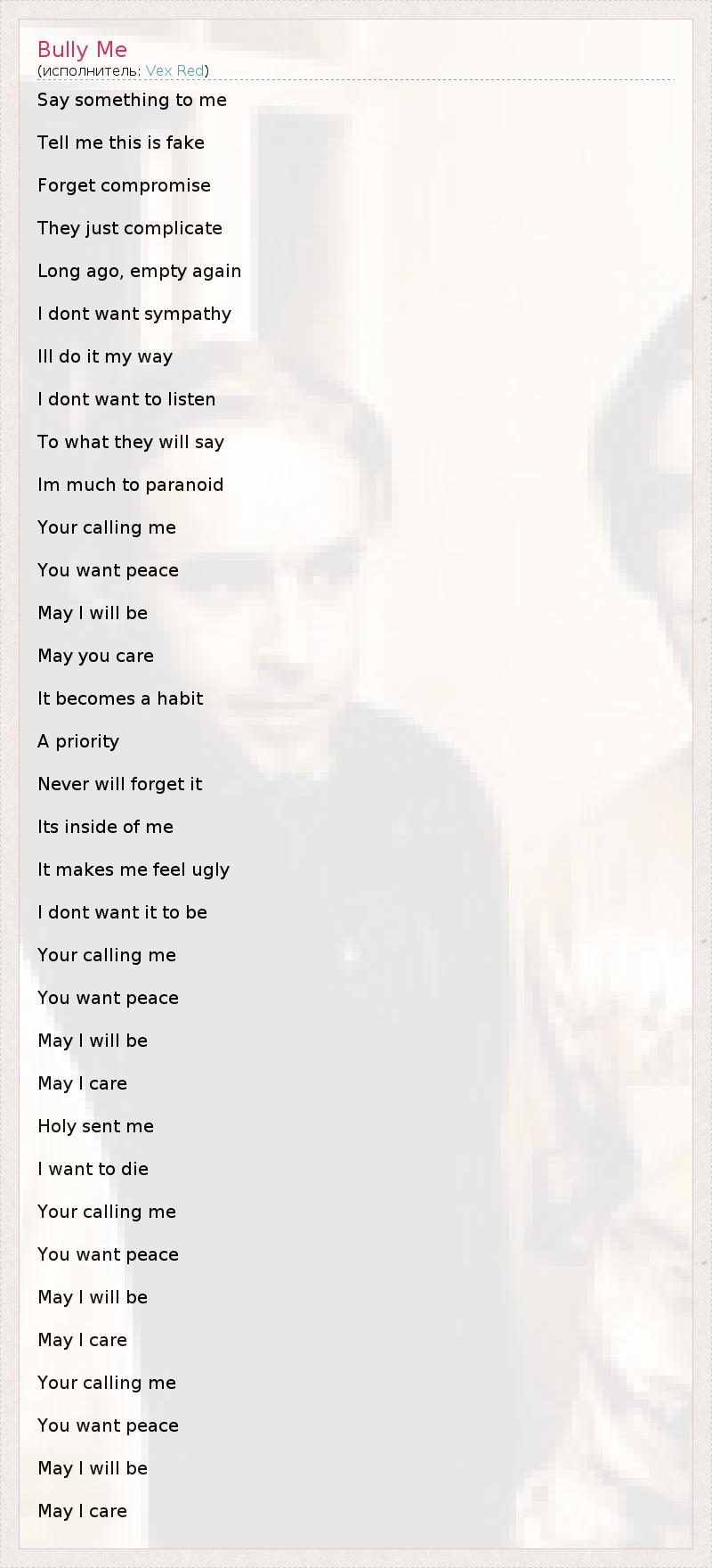 Say something to me Tell me this is fake Forget compromise They just complicate Long ago, empty again I dont want sympathy Ill do it my way I dont want to listen To what they will say Im much to paranoid Your calling me You want peace May I will be May you care It becomes a habit A priority Never will forget it Its inside of me It makes me feel ugly I dont want it to be Your calling me You want peace May I will be May I care Holy sent me I want to die Your calling me You want peace May I will be May I care Your calling me You want peace May I will be May I care