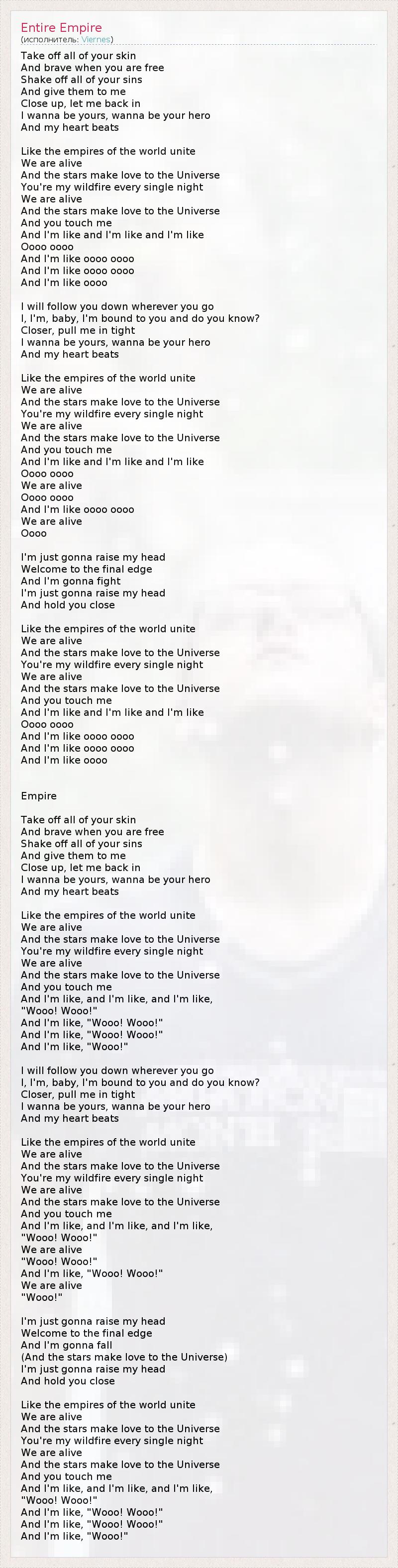 Take off all of your skin And brave when you are free Shake off all of your sins And give them to me Close up, let me back in I wanna be yours, wanna be your hero And my heart beats Like the empires of the world unite We are alive And the stars make love to the Universe You're my wildfire every single night We are alive And the stars make love to the Universe And you touch me And I'm like and I'm like and I'm like Oooo oooo And I'm like oooo oooo And I'm like oooo oooo And I'm like oooo I will follow you down wherever you go I, I'm, baby, I'm bound to you and do you know? Closer, pull me in tight I wanna be yours, wanna be your hero And my heart beats Like the empires of the world unite We are alive And the stars make love to the Universe You're my wildfire every single night We are alive And the stars make love to the Universe And you touch me And I'm like and I'm like and I'm like Oooo oooo We are alive Oooo oooo And I'm like oooo oooo We are alive Oooo I'm just gonna raise my head Welcome to the final edge And I'm gonna fight I'm just gonna raise my head And hold you close Like the empires of the world unite We are alive And the stars make love to the Universe You're my wildfire every single night We are alive And the stars make love to the Universe And you touch me And I'm like and I'm like and I'm like Oooo oooo And I'm like oooo oooo And I'm like oooo oooo And I'm like oooo Empire Take off all of your skin And brave when you are free Shake off all of your sins And give them to me Close up, let me back in I wanna be yours, wanna be your hero And my heart beats Like the empires of the world unite We are alive And the stars make love to the Universe You're my wildfire every single night We are alive And the stars make love to the Universe And you touch me And I'm like, and I'm like, and I'm like, "Wooo! Wooo!" And I'm like, "Wooo! Wooo!" And I'm like, "Wooo! Wooo!" And I'm like, "Wooo!" I will follow you down wherever you go I, I'm, baby, I'm bound to you and do you know? Closer, pull me in tight I wanna be yours, wanna be your hero And my heart beats Like the empires of the world unite We are alive And the stars make love to the Universe You're my wildfire every single night We are alive And the stars make love to the Universe And you touch me And I'm like, and I'm like, and I'm like, "Wooo! Wooo!" We are alive "Wooo! Wooo!" And I'm like, "Wooo! Wooo!" We are alive "Wooo!" I'm just gonna raise my head Welcome to the final edge And I'm gonna fall (And the stars make love to the Universe) I'm just gonna raise my head And hold you close Like the empires of the world unite We are alive And the stars make love to the Universe You're my wildfire every single night We are alive And the stars make love to the Universe And you touch me And I'm like, and I'm like, and I'm like, "Wooo! Wooo!" And I'm like, "Wooo! Wooo!" And I'm like, "Wooo! Wooo!" And I'm like, "Wooo!"