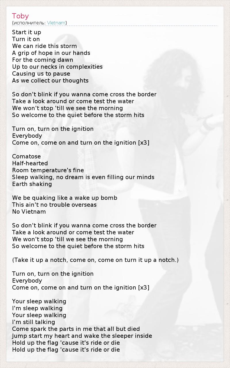 Start it up Turn it on We can ride this storm A grip of hope in our hands For the coming dawn Up to our necks in complexities Causing us to pause As we collect our thoughts So don't blink if you wanna come cross the border Take a look around or come test the water We won't stop 'till we see the morning So welcome to the quiet before the storm hits Turn on, turn on the ignition Everybody Come on, come on and turn on the ignition [x3] Comatose Half-hearted Room temperature's fine Sleep walking, no dream is even filling our minds Earth shaking We be quaking like a wake up bomb This ain't no trouble overseas No Vietnam So don't blink if you wanna come cross the border Take a look around or come test the water We won't stop 'till we see the morning So welcome to the quiet before the storm hits (Take it up a notch, come on, come on turn it up a notch.) Turn on, turn on the ignition Everybody Come on, come on and turn on the ignition [x3] Your sleep walking I'm sleep walking Your sleep walking I'm still talking Come spark the parts in me that all but died Jump start my heart and wake the sleeper inside Hold up the flag 'cause it's ride or die Hold up the flag 'cause it's ride or die