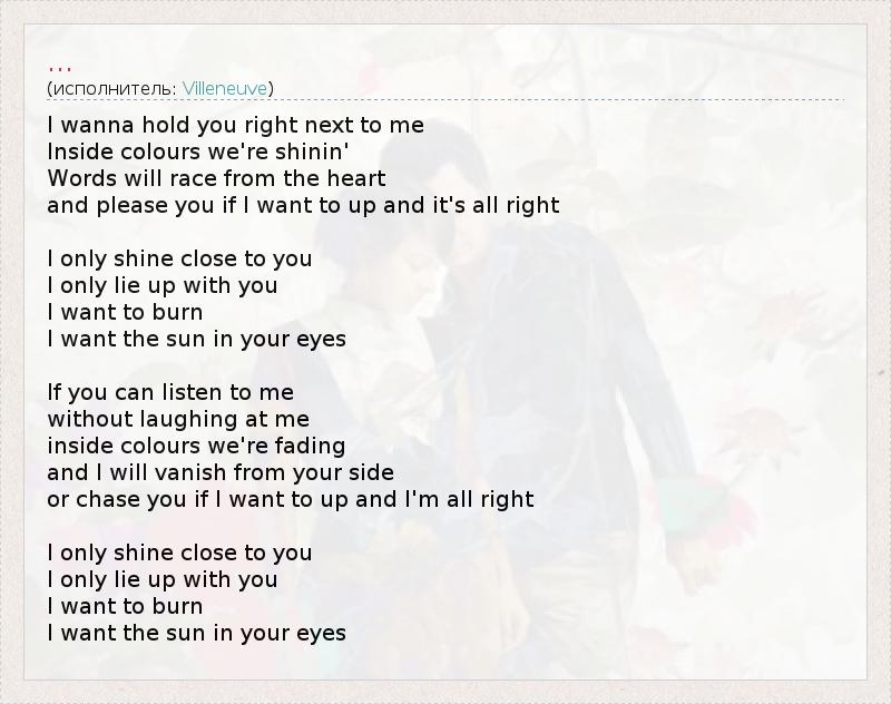 I wanna hold you right next to me Inside colours we're shinin' Words will race from the heart and please you if I want to up and it's all right I only shine close to you I only lie up with you I want to burn I want the sun in your eyes If you can listen to me without laughing at me inside colours we're fading and I will vanish from your side or chase you if I want to up and I'm all right I only shine close to you I only lie up with you I want to burn I want the sun in your eyes