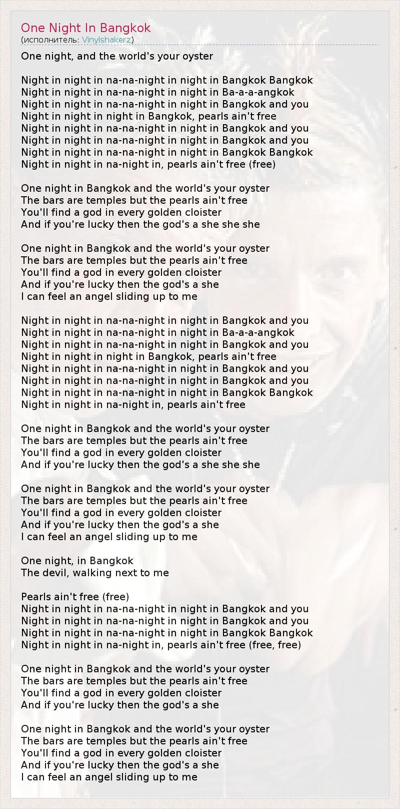 А как ты думаешь, о чем песня "One Night In Bangkok" ?