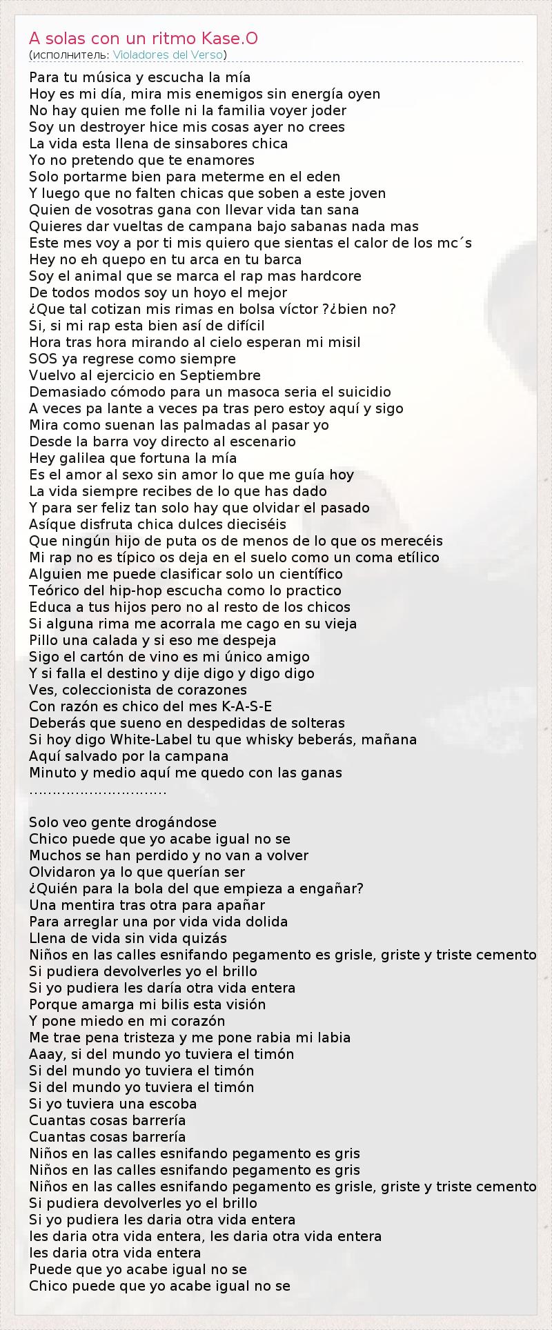 Para tu música y escucha la mía Hoy es mi día, mira mis enemigos sin energía oyen No hay quien me folle ni la familia voyer joder Soy un destroyer hice mis cosas ayer no crees La vida esta llena de sinsabores chica Yo no pretendo que te enamores Solo portarme bien para meterme en el eden Y luego que no falten chicas que soben a este joven Quien de vosotras gana con llevar vida tan sana Quieres dar vueltas de campana bajo sabanas nada mas Este mes voy a por ti mis quiero que sientas el calor de los mc´s Hey no eh quepo en tu arca en tu barca Soy el animal que se marca el rap mas hardcore De todos modos soy un hoyo el mejor ¿Que tal cotizan mis rimas en bolsa víctor ?¿bien no? Si, si mi rap esta bien así de difícil Hora tras hora mirando al cielo esperan mi misil SOS ya regrese como siempre Vuelvo al ejercicio en Septiembre Demasiado cómodo para un masoca seria el suicidio A veces pa lante a veces pa tras pero estoy aquí y sigo Mira como suenan las palmadas al pasar yo Desde la barra voy directo al escenario Hey galilea que fortuna la mía Es el amor al sexo sin amor lo que me guía hoy La vida siempre recibes de lo que has dado Y para ser feliz tan solo hay que olvidar el pasado Asíque disfruta chica dulces dieciséis Que ningún hijo de puta os de menos de lo que os merecéis Mi rap no es típico os deja en el suelo como un coma etílico Alguien me puede clasificar solo un científico Teórico del hip-hop escucha como lo practico Educa a tus hijos pero no al resto de los chicos Si alguna rima me acorrala me cago en su vieja Pillo una calada y si eso me despeja Sigo el cartón de vino es mi único amigo Y si falla el destino y dije digo y digo digo Ves, coleccionista de corazones Con razón es chico del mes K-A-S-E Deberás que sueno en despedidas de solteras Si hoy digo White-Label tu que whisky beberás, mañana Aquí salvado por la campana Minuto y medio aquí me quedo con las ganas ………………………… Solo veo gente drogándose Chico puede que yo acabe igual no se Muchos se han perdido y no van a volver Olvidaron ya lo que querían ser ¿Quién para la bola del que empieza a engañar? Una mentira tras otra para apañar Para arreglar una por vida vida dolida Llena de vida sin vida quizás Niños en las calles esnifando pegamento es grisle, griste y triste cemento Si pudiera devolverles yo el brillo Si yo pudiera les daría otra vida entera Porque amarga mi bilis esta visión Y pone miedo en mi corazón Me trae pena tristeza y me pone rabia mi labia Aaay, si del mundo yo tuviera el timón Si del mundo yo tuviera el timón Si del mundo yo tuviera el timón Si yo tuviera una escoba Cuantas cosas barrería Cuantas cosas barrería Niños en las calles esnifando pegamento es gris Niños en las calles esnifando pegamento es gris Niños en las calles esnifando pegamento es grisle, griste y triste cemento Si pudiera devolverles yo el brillo Si yo pudiera les daria otra vida entera les daria otra vida entera, les daria otra vida entera les daria otra vida entera Puede que yo acabe igual no se Chico puede que yo acabe igual no se