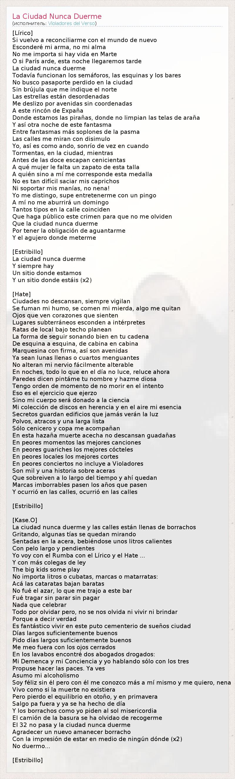 [Lírico] Si vuelvo a reconciliarme con el mundo de nuevo Esconderé mi arma, no mi alma No me importa si hay vida en Marte O si París arde, esta noche llegaremos tarde La ciudad nunca duerme Todavía funcionan los semáforos, las esquinas y los bares No busco pasaporte perdido en la ciudad Sin brújula que me indique el norte Las estrellas están desordenadas Me deslizo por avenidas sin coordenadas A este rincón de Expaña Donde estamos las pirañas, donde no limpian las telas de araña Y así otra noche de este fantasma Entre fantasmas más soplones de la pasma Las calles me miran con disimulo Yo, así es como ando, sonrío de vez en cuando Tormentas, en la ciudad, mientras Antes de las doce escapan cenicientas A qué mujer le falta un zapato de esta talla A quién sino a mí me corresponde esta medalla No es tan difícil saciar mis caprichos Ni soportar mis manías, no nena! Yo me distingo, supe entretenerme con un pingo A mí no me aburrirá un domingo Tantos tipos en la calle coinciden Que haga público este crimen para que no me olviden Que la ciudad nunca duerme Por tener la obligación de aguantarme Y el agujero donde meterme [Estribillo] La ciudad nunca duerme Y siempre hay Un sitio donde estamos Y un sitio donde estáis (x2) [Hate] Ciudades no descansan, siempre vigilan Se fuman mi humo, se comen mi mierda, algo me quitan Ojos que ven corazones que sienten Lugares subterráneos esconden a intérpretes Ratas de local bajo techo planean La forma de seguir sonando bien en tu cadena De esquina a esquina, de cabina en cabina Marquesina con firma, así son avenidas Ya sean lunas llenas o cuartos menguantes No alteran mi nervio fácilmente alterable En noches, todo lo que en el día no luce, reluce ahora Paredes dicen pintáme tu nombre y hazme diosa Tengo orden de momento de no morir en el intento Eso es el ejercicio que ejerzo Sino mi cuerpo será donado a la ciencia Mi colección de discos en herencia y en el aire mi esencia Secretos guardan edificios que jamás verán la luz Polvos, atracos y una larga lista Sólo cenicero y copa me acompañan En esta hazaña muerte acecha no descansan guadañas En peores momentos las mejores canciones En peores guariches los mejores cócteles En peores locales los mejores cortes En peores conciertos no incluye a Violadores Son mil y una historia sobre aceras Que sobreiven a lo largo del tiempo y ahí quedan Marcas imborrables pasen los años que pasen Y ocurrió en las calles, ocurrió en las calles [Estribillo] [Kase.O] La ciudad nunca duerme y las calles están llenas de borrachos Gritando, algunas tías se quedan mirando Sentadas en la acera, bebiéndose unos litros calientes Con pelo largo y pendientes Yo voy con el Rumba con el Lírico y el Hate ... Y con más colegas de ley The big kids some play No importa litros o cubatas, marcas o matarratas: Acá las cataratas bajan baratas No fué el azar, lo que me trajo a este bar Fué tragar sin parar sin pagar Nada que celebrar Todo por olvidar pero, no se nos olvida ni vivir ni brindar Porque a decir verdad Es fantástico vivir en este puto cementerio de sueños ciudad Días largos suficientemente buenos Pido días largos suficientemente buenos Me meo fuera con los ojos cerrados En los lavabos encontré dos abogados drogados: Mi Demenca y mi Conciencia y yo hablando sólo con los tres Propuse hacer las paces. Ya ves Asumo mi alcoholismo Soy féliz sin él pero con él me conozco más a mí mismo y me quiero, nena Vivo como si la muerte no existiera Pero pierdo el equilibrio en otoño, y en primavera Salgo pa fuera y ya se ha hecho de día Y los borrachos como yo piden al sol misericordia El camión de la basura se ha olvidao de recogerme El 32 no pasa y la ciudad nunca duerme Agradecer un nuevo amanecer borracho Con la impresión de estar en medio de ningún dónde (x2) No duermo... [Estribillo]