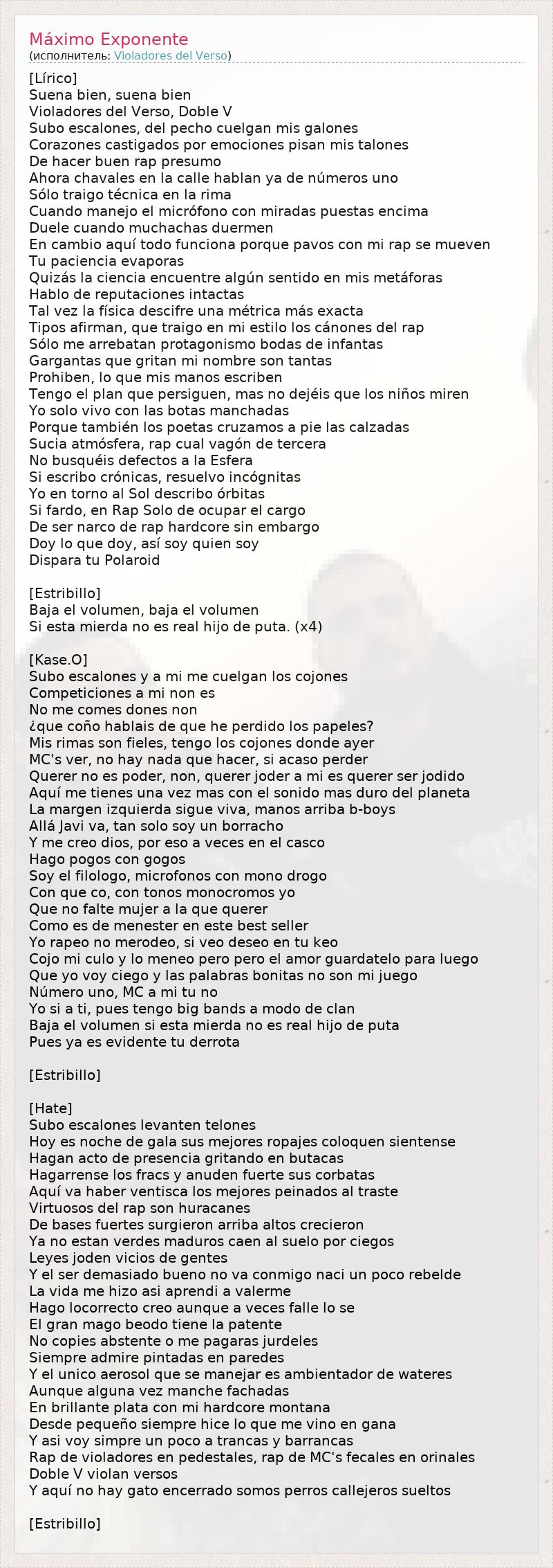 [Lírico] Suena bien, suena bien Violadores del Verso, Doble V Subo escalones, del pecho cuelgan mis galones Corazones castigados por emociones pisan mis talones De hacer buen rap presumo Ahora chavales en la calle hablan ya de números uno Sólo traigo técnica en la rima Cuando manejo el micrófono con miradas puestas encima Duele cuando muchachas duermen En cambio aquí todo funciona porque pavos con mi rap se mueven Tu paciencia evaporas Quizás la ciencia encuentre algún sentido en mis metáforas Hablo de reputaciones intactas Tal vez la física descifre una métrica más exacta Tipos afirman, que traigo en mi estilo los cánones del rap Sólo me arrebatan protagonismo bodas de infantas Gargantas que gritan mi nombre son tantas Prohiben, lo que mis manos escriben Tengo el plan que persiguen, mas no dejéis que los niños miren Yo solo vivo con las botas manchadas Porque también los poetas cruzamos a pie las calzadas Sucia atmósfera, rap cual vagón de tercera No busquéis defectos a la Esfera Si escribo crónicas, resuelvo incógnitas Yo en torno al Sol describo órbitas Si fardo, en Rap Solo de ocupar el cargo De ser narco de rap hardcore sin embargo Doy lo que doy, así soy quien soy Dispara tu Polaroid [Estribillo] Baja el volumen, baja el volumen Si esta mierda no es real hijo de puta. (x4) [Kase.O] Subo escalones y a mi me cuelgan los cojones Competiciones a mi non es No me comes dones non ¿que coño hablais de que he perdido los papeles? Mis rimas son fieles, tengo los cojones donde ayer MC's ver, no hay nada que hacer, si acaso perder Querer no es poder, non, querer joder a mi es querer ser jodido Aquí me tienes una vez mas con el sonido mas duro del planeta La margen izquierda sigue viva, manos arriba b-boys Allá Javi va, tan solo soy un borracho Y me creo dios, por eso a veces en el casco Hago pogos con gogos Soy el filologo, microfonos con mono drogo Con que co, con tonos monocromos yo Que no falte mujer a la que querer Como es de menester en este best seller Yo rapeo no merodeo, si veo deseo en tu keo Cojo mi culo y lo meneo pero pero el amor guardatelo para luego Que yo voy ciego y las palabras bonitas no son mi juego Número uno, MC a mi tu no Yo si a ti, pues tengo big bands a modo de clan Baja el volumen si esta mierda no es real hijo de puta Pues ya es evidente tu derrota [Estribillo] [Hate] Subo escalones levanten telones Hoy es noche de gala sus mejores ropajes coloquen sientense Hagan acto de presencia gritando en butacas Hagarrense los fracs y anuden fuerte sus corbatas Aquí va haber ventisca los mejores peinados al traste Virtuosos del rap son huracanes De bases fuertes surgieron arriba altos crecieron Ya no estan verdes maduros caen al suelo por ciegos Leyes joden vicios de gentes Y el ser demasiado bueno no va conmigo naci un poco rebelde La vida me hizo asi aprendi a valerme Hago locorrecto creo aunque a veces falle lo se El gran mago beodo tiene la patente No copies abstente o me pagaras jurdeles Siempre admire pintadas en paredes Y el unico aerosol que se manejar es ambientador de wateres Aunque alguna vez manche fachadas En brillante plata con mi hardcore montana Desde pequeño siempre hice lo que me vino en gana Y asi voy simpre un poco a trancas y barrancas Rap de violadores en pedestales, rap de MC's fecales en orinales Doble V violan versos Y aquí no hay gato encerrado somos perros callejeros sueltos [Estribillo]