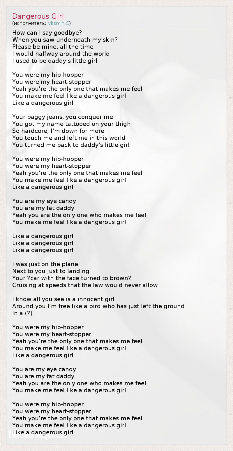 How can I say goodbye? When you saw underneath my skin? Please be mine, all the time I would halfway around the world I used to be daddy's little girl You were my hip-hopper You were my heart-stopper Yeah you're the only one that makes me feel You make me feel like a dangerous girl Like a dangerous girl Your baggy jeans, you conquer me You got my name tattooed on your thigh So hardcore, I'm down for more You touch me and left me in this world You turned me back to daddy's little girl You were my hip-hopper You were my heart-stopper Yeah you're the only one that makes me feel You make me feel like a dangerous girl Like a dangerous girl You are my eye candy You are my fat daddy Yeah you are the only one who makes me feel You make me feel like a dangerous girl Like a dangerous girl Like a dangerous girl Like a dangerous girl I was just on the plane Next to you just to landing Your ?car with the face turned to brown? Cruising at speeds that the law would never allow I know all you see is a innocent girl Around you I'm free like a bird who has just left the ground In a (?) You were my hip-hopper You were my heart-stopper Yeah you're the only one that makes me feel You make me feel like a dangerous girl Like a dangerous girl You are my eye candy You are my fat daddy Yeah you are the only one who makes me feel You make me feel like a dangerous girl You were my hip-hopper You were my heart-stopper Yeah you're the only one that makes me feel You make me feel like a dangerous girl Like a dangerous girl