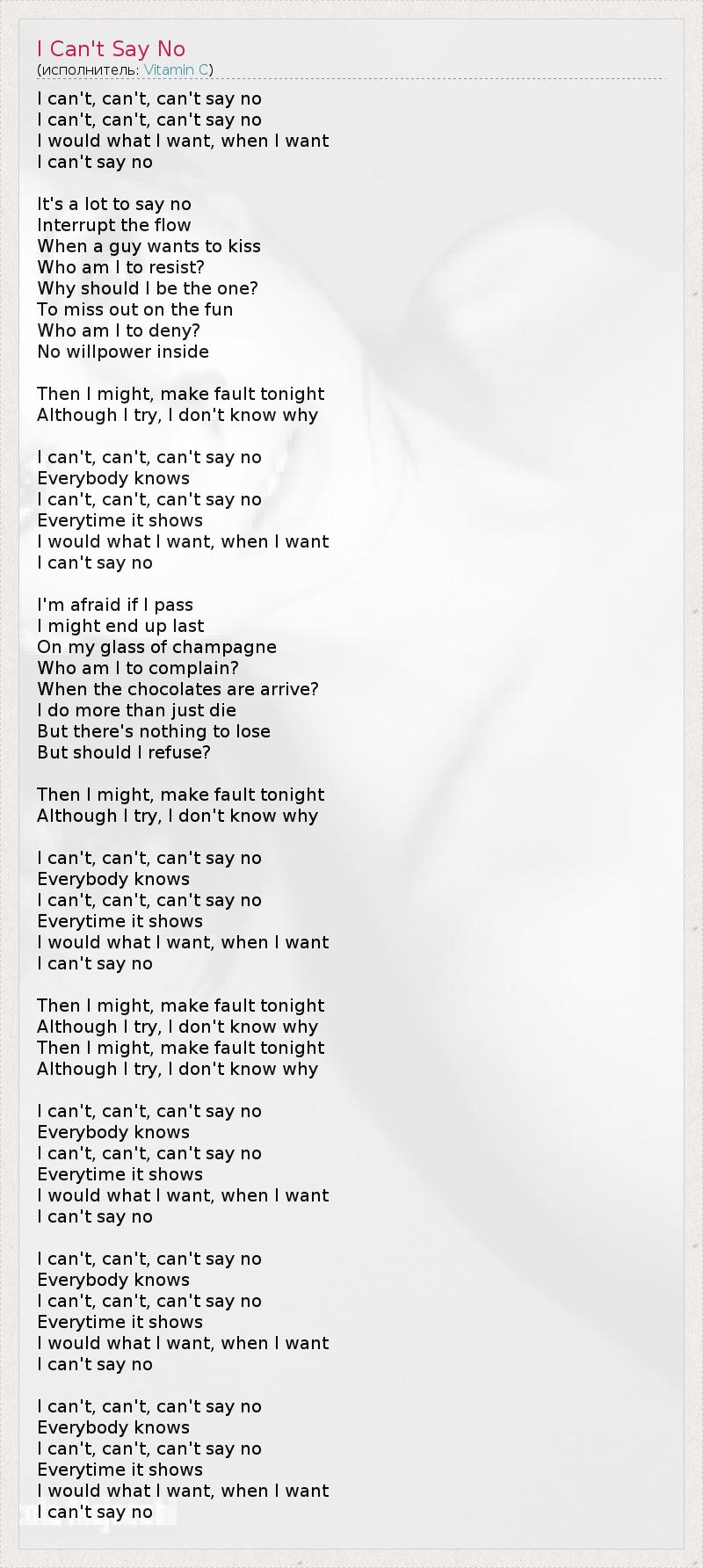 I can't, can't, can't say no I can't, can't, can't say no I would what I want, when I want I can't say no It's a lot to say no Interrupt the flow When a guy wants to kiss Who am I to resist? Why should I be the one? To miss out on the fun Who am I to deny? No willpower inside Then I might, make fault tonight Although I try, I don't know why I can't, can't, can't say no Everybody knows I can't, can't, can't say no Everytime it shows I would what I want, when I want I can't say no I'm afraid if I pass I might end up last On my glass of champagne Who am I to complain? When the chocolates are arrive? I do more than just die But there's nothing to lose But should I refuse? Then I might, make fault tonight Although I try, I don't know why I can't, can't, can't say no Everybody knows I can't, can't, can't say no Everytime it shows I would what I want, when I want I can't say no Then I might, make fault tonight Although I try, I don't know why Then I might, make fault tonight Although I try, I don't know why I can't, can't, can't say no Everybody knows I can't, can't, can't say no Everytime it shows I would what I want, when I want I can't say no I can't, can't, can't say no Everybody knows I can't, can't, can't say no Everytime it shows I would what I want, when I want I can't say no I can't, can't, can't say no Everybody knows I can't, can't, can't say no Everytime it shows I would what I want, when I want I can't say no
