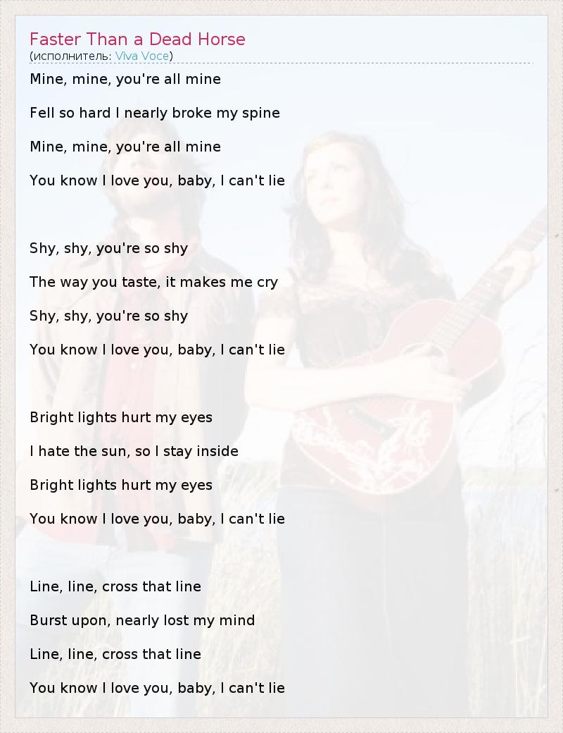 Mine, mine, you're all mine Fell so hard I nearly broke my spine Mine, mine, you're all mine You know I love you, baby, I can't lie Shy, shy, you're so shy The way you taste, it makes me cry Shy, shy, you're so shy You know I love you, baby, I can't lie Bright lights hurt my eyes I hate the sun, so I stay inside Bright lights hurt my eyes You know I love you, baby, I can't lie Line, line, cross that line Burst upon, nearly lost my mind Line, line, cross that line You know I love you, baby, I can't lie