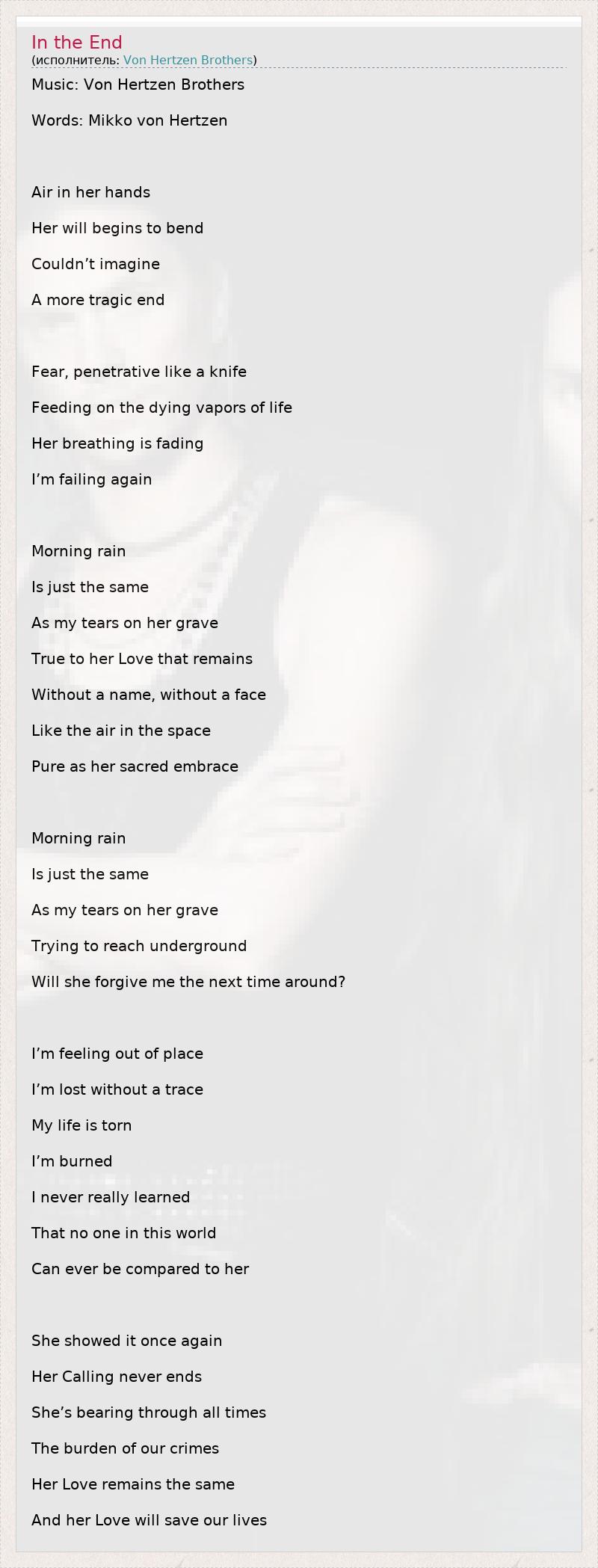 Music: Von Hertzen Brothers Words: Mikko von Hertzen Air in her hands Her will begins to bend Couldn’t imagine A more tragic end Fear, penetrative like a knife Feeding on the dying vapors of life Her breathing is fading I’m failing again Morning rain Is just the same As my tears on her grave True to her Love that remains Without a name, without a face Like the air in the space Pure as her sacred embrace Morning rain Is just the same As my tears on her grave Trying to reach underground Will she forgive me the next time around? I’m feeling out of place I’m lost without a trace My life is torn I’m burned I never really learned That no one in this world Can ever be compared to her She showed it once again Her Calling never ends She’s bearing through all times The burden of our crimes Her Love remains the same And her Love will save our lives