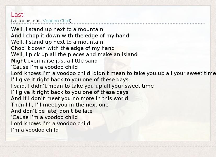 Well, I stand up next to a mountain And I chop it down with the edge of my hand Well, I stand up next to a mountain Chop it down with the edge of my hand Well, I pick up all the pieces and make an island Might even raise just a little sand 'Cause I'm a voodoo child Lord knows I'm a voodoo childI didn't mean to take you up all your sweet time I'll give it right back to you one of these days I said, I didn't mean to take you up all your sweet time I'll give it right back to you one of these days And if I don't meet you no more in this world Then I'll, I'll meet you in the next one And don't be late, don't be late 'Cause I'm a voodoo child Lord knows I'm a voodoo child I'm a voodoo child
