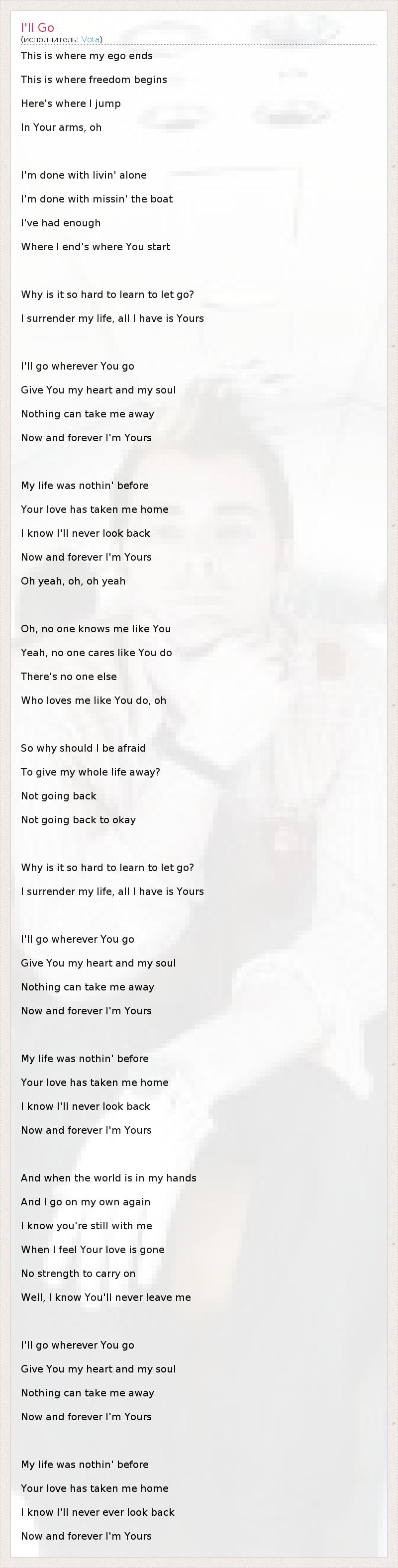 This is where my ego ends This is where freedom begins Here's where I jump In Your arms, oh I'm done with livin' alone I'm done with missin' the boat I've had enough Where I end's where You start Why is it so hard to learn to let go? I surrender my life, all I have is Yours I'll go wherever You go Give You my heart and my soul Nothing can take me away Now and forever I'm Yours My life was nothin' before Your love has taken me home I know I'll never look back Now and forever I'm Yours Oh yeah, oh, oh yeah Oh, no one knows me like You Yeah, no one cares like You do There's no one else Who loves me like You do, oh So why should I be afraid To give my whole life away? Not going back Not going back to okay Why is it so hard to learn to let go? I surrender my life, all I have is Yours I'll go wherever You go Give You my heart and my soul Nothing can take me away Now and forever I'm Yours My life was nothin' before Your love has taken me home I know I'll never look back Now and forever I'm Yours And when the world is in my hands And I go on my own again I know you're still with me When I feel Your love is gone No strength to carry on Well, I know You'll never leave me I'll go wherever You go Give You my heart and my soul Nothing can take me away Now and forever I'm Yours My life was nothin' before Your love has taken me home I know I'll never ever look back Now and forever I'm Yours