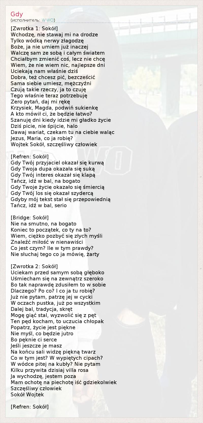 [Zwrotka 1: Sokół] Wchodzę, nie stawaj mi na drodze Tylko wódką nerwy złagodzę Boże, ja nie umiem już inaczej Walczę sam ze sobą i całym światem Chciałbym zmienić coś, lecz nie chcę Wiem, że nie wiem nic, najlepsze dni Uciekają nam właśnie dziś Dobra, też chcesz pić, bezcześcić Sama siebie umiesz, mężczyźni Czują takie rzeczy, ja to czuję Tego właśnie teraz potrzebuję Zero pytań, daj mi rękę Krzysiek, Magda, podwiń sukienkę A kto mówił ci, że będzie łatwo? Szanuję dni kiedy idzie mi gładko życie Dziś picie, nie śpijcie, halo Dawaj wariat, czekam tu na ciebie waląc Jezus, Maria, co ja robię? Wojtek Sokół, szczęśliwy człowiek [Refren: Sokół] Gdy Twój przyjaciel okazał się kurwą Gdy Twoja dupa okazała się suką Gdy Twój interes okazał się klapą Tańcz, idź w bal, na bogato Gdy Twoje życie okazało się śmiercią Gdy Twój los się okazał szydercą Gdyby mój tekst stał się przepowiednią Tańcz, idź w bal, serio [Bridge: Sokół] Nie na smutno, na bogato Koniec to początek, co ty na to? Wiem, ciężko pozbyć się złych myśli Znaleźć miłość w nienawiści Co jest czym? Ile w tym prawdy? Nie słuchaj tego co ja mówię, żarty [Zwrotka 2: Sokół] Uciekam przed samym sobą głęboko Uśmiecham się na zewnątrz szeroko Bo tak naprawdę zdusiłem to w sobie Dlaczego? Po co? I co ja tu robię? Już nie pytam, patrzę jej w cycki W oczach pustka, już po wszystkim Dalej bal, tradycja, skręt Mogę giąć stal, wyzwolić się z pęt Ten pęd kocham, to uczucia chłopak Popatrz, życie jest piękne Nie myśl, co będzie jutro Bo pęknie ci serce Jeśli jeszcze je masz Na końcu sali widzę piękną twarz Co w tym jest? W wypiętych cipach? W wódce pitej na kubły? Nie pytam Kilku przywita dzisiaj villa rosa Ja wychodzę, jestem poza Mam ochotę na piechotę iść gdziekolwiek Szczęśliwy człowiek Sokół Wojtek [Refren: Sokół]