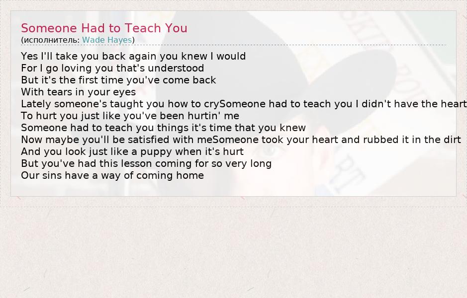 Yes I'll take you back again you knew I would For I go loving you that's understood But it's the first time you've come back With tears in your eyes Lately someone's taught you how to crySomeone had to teach you I didn't have the heart To hurt you just like you've been hurtin' me Someone had to teach you things it's time that you knew Now maybe you'll be satisfied with meSomeone took your heart and rubbed it in the dirt And you look just like a puppy when it's hurt But you've had this lesson coming for so very long Our sins have a way of coming home