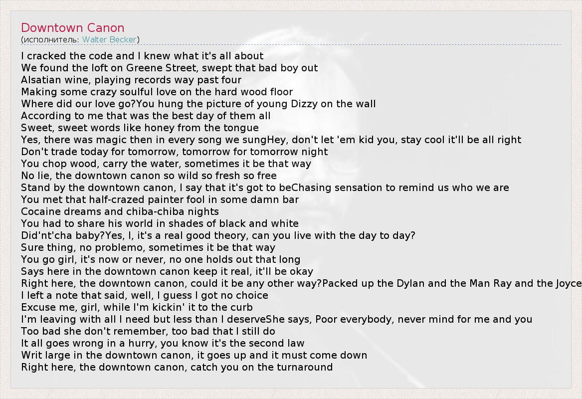 I cracked the code and I knew what it's all about We found the loft on Greene Street, swept that bad boy out Alsatian wine, playing records way past four Making some crazy soulful love on the hard wood floor Where did our love go?You hung the picture of young Dizzy on the wall According to me that was the best day of them all Sweet, sweet words like honey from the tongue Yes, there was magic then in every song we sungHey, don't let 'em kid you, stay cool it'll be all right Don't trade today for tomorrow, tomorrow for tomorrow night You chop wood, carry the water, sometimes it be that way No lie, the downtown canon so wild so fresh so free Stand by the downtown canon, I say that it's got to beChasing sensation to remind us who we are You met that half-crazed painter fool in some damn bar Cocaine dreams and chiba-chiba nights You had to share his world in shades of black and white Did'nt'cha baby?Yes, I, it's a real good theory, can you live with the day to day? Sure thing, no problemo, sometimes it be that way You go girl, it's now or never, no one holds out that long Says here in the downtown canon keep it real, it'll be okay Right here, the downtown canon, could it be any other way?Packed up the Dylan and the Man Ray and the Joyce I left a note that said, well, I guess I got no choice Excuse me, girl, while I'm kickin' it to the curb I'm leaving with all I need but less than I deserveShe says, Poor everybody, never mind for me and you Too bad she don't remember, too bad that I still do It all goes wrong in a hurry, you know it's the second law Writ large in the downtown canon, it goes up and it must come down Right here, the downtown canon, catch you on the turnaround