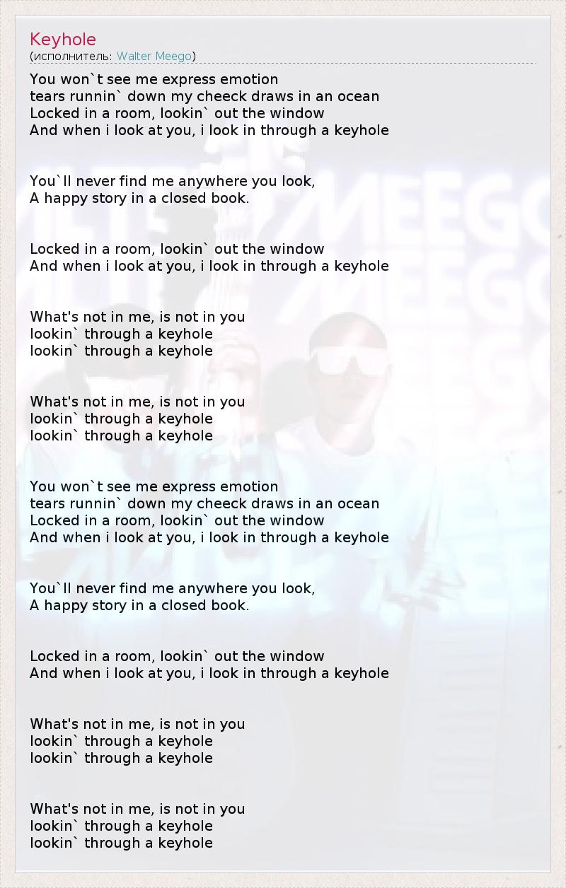 You won`t see me express emotion tears runnin` down my cheeck draws in an ocean Locked in a room, lookin` out the window And when i look at you, i look in through a keyhole You`ll never find me anywhere you look, A happy story in a closed book. Locked in a room, lookin` out the window And when i look at you, i look in through a keyhole What's not in me, is not in you lookin` through a keyhole lookin` through a keyhole What's not in me, is not in you lookin` through a keyhole lookin` through a keyhole You won`t see me express emotion tears runnin` down my cheeck draws in an ocean Locked in a room, lookin` out the window And when i look at you, i look in through a keyhole You`ll never find me anywhere you look, A happy story in a closed book. Locked in a room, lookin` out the window And when i look at you, i look in through a keyhole What's not in me, is not in you lookin` through a keyhole lookin` through a keyhole What's not in me, is not in you lookin` through a keyhole lookin` through a keyhole