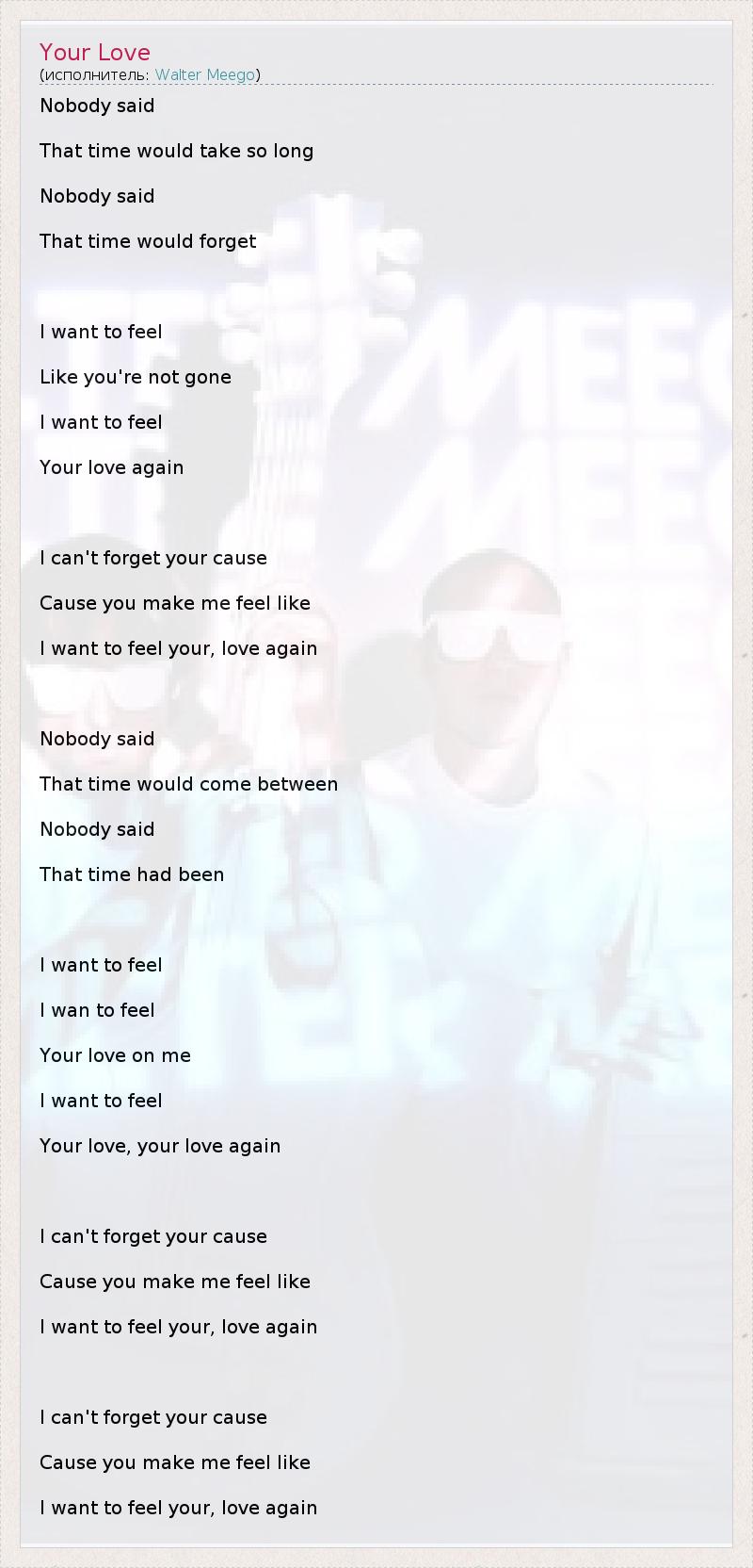 Nobody said That time would take so long Nobody said That time would forget I want to feel Like you're not gone I want to feel Your love again I can't forget your cause Cause you make me feel like I want to feel your, love again Nobody said That time would come between Nobody said That time had been I want to feel I wan to feel Your love on me I want to feel Your love, your love again I can't forget your cause Cause you make me feel like I want to feel your, love again I can't forget your cause Cause you make me feel like I want to feel your, love again