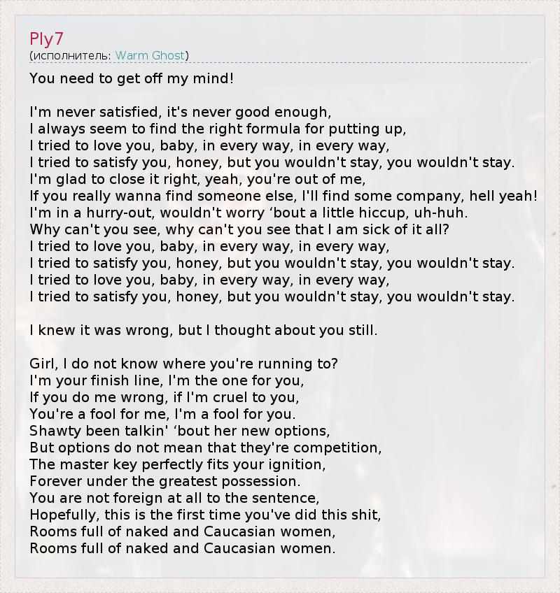You need to get off my mind! I'm never satisfied, it's never good enough, I always seem to find the right formula for putting up, I tried to love you, baby, in every way, in every way, I tried to satisfy you, honey, but you wouldn't stay, you wouldn't stay. I'm glad to close it right, yeah, you're out of me, If you really wanna find someone else, I'll find some company, hell yeah! I'm in a hurry-out, wouldn't worry ‘bout a little hiccup, uh-huh. Why can't you see, why can't you see that I am sick of it all? I tried to love you, baby, in every way, in every way, I tried to satisfy you, honey, but you wouldn't stay, you wouldn't stay. I tried to love you, baby, in every way, in every way, I tried to satisfy you, honey, but you wouldn't stay, you wouldn't stay. I knew it was wrong, but I thought about you still. Girl, I do not know where you're running to? I'm your finish line, I'm the one for you, If you do me wrong, if I'm cruel to you, You're a fool for me, I'm a fool for you. Shawty been talkin' ‘bout her new options, But options do not mean that they're competition, The master key perfectly fits your ignition, Forever under the greatest possession. You are not foreign at all to the sentence, Hopefully, this is the first time you've did this shit, Rooms full of naked and Caucasian women, Rooms full of naked and Caucasian women.