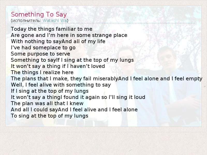 Today the things familiar to me Are gone and I'm here in some strange place With nothing to sayAnd all of my life I've had someplace to go Some purpose to serve Something to sayIf I sing at the top of my lungs It won't say a thing if I haven't loved The things I realize here The plans that I make, they fail miserablyAnd I feel alone and I feel empty Well, I feel alive with something to say If I sing at the top of my lungs It won't say a thingI found it again so I'll sing it loud The plan was all that I knew And all I could sayAnd I feel alive and I feel alone To sing at the top of my lungs