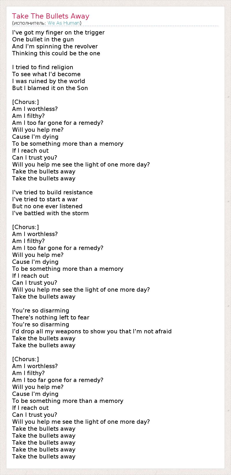 I've got my finger on the trigger One bullet in the gun And I'm spinning the revolver Thinking this could be the one I tried to find religion To see what I'd become I was ruined by the world But I blamed it on the Son [Chorus:] Am I worthless? Am I filthy? Am I too far gone for a remedy? Will you help me? Cause I'm dying To be something more than a memory If I reach out Can I trust you? Will you help me see the light of one more day? Take the bullets away Take the bullets away I've tried to build resistance I've tried to start a war But no one ever listened I've battled with the storm [Chorus:] Am I worthless? Am I filthy? Am I too far gone for a remedy? Will you help me? Cause I'm dying To be something more than a memory If I reach out Can I trust you? Will you help me see the light of one more day? Take the bullets away You're so disarming There's nothing left to fear You're so disarming I'd drop all my weapons to show you that I'm not afraid Take the bullets away Take the bullets away [Chorus:] Am I worthless? Am I filthy? Am I too far gone for a remedy? Will you help me? Cause I'm dying To be something more than a memory If I reach out Can I trust you? Will you help me see the light of one more day? Take the bullets away Take the bullets away Take the bullets away Take the bullets away Take the bullets away