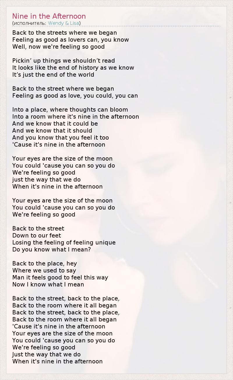 Back to the streets where we began Feeling as good as lovers can, you know Well, now we're feeling so good Pickin’ up things we shouldn’t read It looks like the end of history as we know It’s just the end of the world Back to the street where we began Feeling as good as love, you could, you can Into a place, where thoughts can bloom Into a room where it's nine in the afternoon And we know that it could be And we know that it should And you know that you feel it too 'Cause it's nine in the afternoon Your eyes are the size of the moon You could 'cause you can so you do We're feeling so good just the way that we do When it's nine in the afternoon Your eyes are the size of the moon You could 'cause you can so you do We're feeling so good Back to the street Down to our feet Losing the feeling of feeling unique Do you know what I mean? Back to the place, hey Where we used to say Man it feels good to feel this way Now I know what I mean Back to the street, back to the place, Back to the room where it all began Back to the street, back to the place, Back to the room where it all began 'Cause it's nine in the afternoon Your eyes are the size of the moon You could 'cause you can so you do We're feeling so good Just the way that we do When it's nine in the afternoon