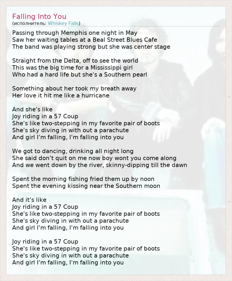 Passing through Memphis one night in May Saw her waiting tables at a Beal Street Blues Cafe The band was playing strong but she was center stage Straight from the Delta, off to see the world This was the big time for a Mississippi girl Who had a hard life but she's a Southern pearl Something about her took my breath away Her love it hit me like a hurricane And she's like Joy riding in a 57 Coup She's like two-stepping in my favorite pair of boots She's sky diving in with out a parachute And girl I'm falling, I'm falling into you We got to dancing, drinking all night long She said don't quit on me now boy wont you come along And we went down by the river, skinny-dipping till the dawn Spent the morning fishing fried them up by noon Spent the evening kissing near the Southern moon And it's like Joy riding in a 57 Coup She's like two-stepping in my favorite pair of boots She's sky diving in with out a parachute And girl I'm falling, I'm falling into you Joy riding in a 57 Coup She's like two-stepping in my favorite pair of boots She's sky diving in with out a parachute And girl I'm falling, I'm falling into you