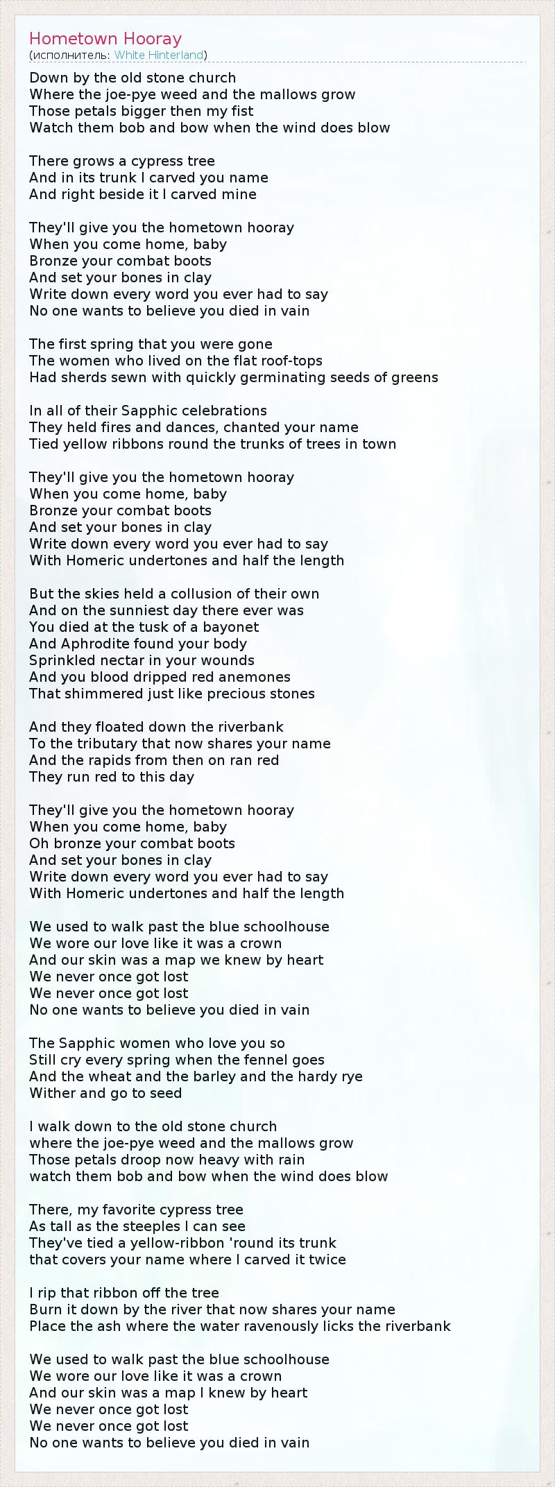Down by the old stone church Where the joe-pye weed and the mallows grow Those petals bigger then my fist Watch them bob and bow when the wind does blow There grows a cypress tree And in its trunk I carved you name And right beside it I carved mine They'll give you the hometown hooray When you come home, baby Bronze your combat boots And set your bones in clay Write down every word you ever had to say No one wants to believe you died in vain The first spring that you were gone The women who lived on the flat roof-tops Had sherds sewn with quickly germinating seeds of greens In all of their Sapphic celebrations They held fires and dances, chanted your name Tied yellow ribbons round the trunks of trees in town They'll give you the hometown hooray When you come home, baby Bronze your combat boots And set your bones in clay Write down every word you ever had to say With Homeric undertones and half the length But the skies held a collusion of their own And on the sunniest day there ever was You died at the tusk of a bayonet And Aphrodite found your body Sprinkled nectar in your wounds And you blood dripped red anemones That shimmered just like precious stones And they floated down the riverbank To the tributary that now shares your name And the rapids from then on ran red They run red to this day They'll give you the hometown hooray When you come home, baby Oh bronze your combat boots And set your bones in clay Write down every word you ever had to say With Homeric undertones and half the length We used to walk past the blue schoolhouse We wore our love like it was a crown And our skin was a map we knew by heart We never once got lost We never once got lost No one wants to believe you died in vain The Sapphic women who love you so Still cry every spring when the fennel goes And the wheat and the barley and the hardy rye Wither and go to seed I walk down to the old stone church where the joe-pye weed and the mallows grow Those petals droop now heavy with rain watch them bob and bow when the wind does blow There, my favorite cypress tree As tall as the steeples I can see They've tied a yellow-ribbon 'round its trunk that covers your name where I carved it twice I rip that ribbon off the tree Burn it down by the river that now shares your name Place the ash where the water ravenously licks the riverbank We used to walk past the blue schoolhouse We wore our love like it was a crown And our skin was a map I knew by heart We never once got lost We never once got lost No one wants to believe you died in vain