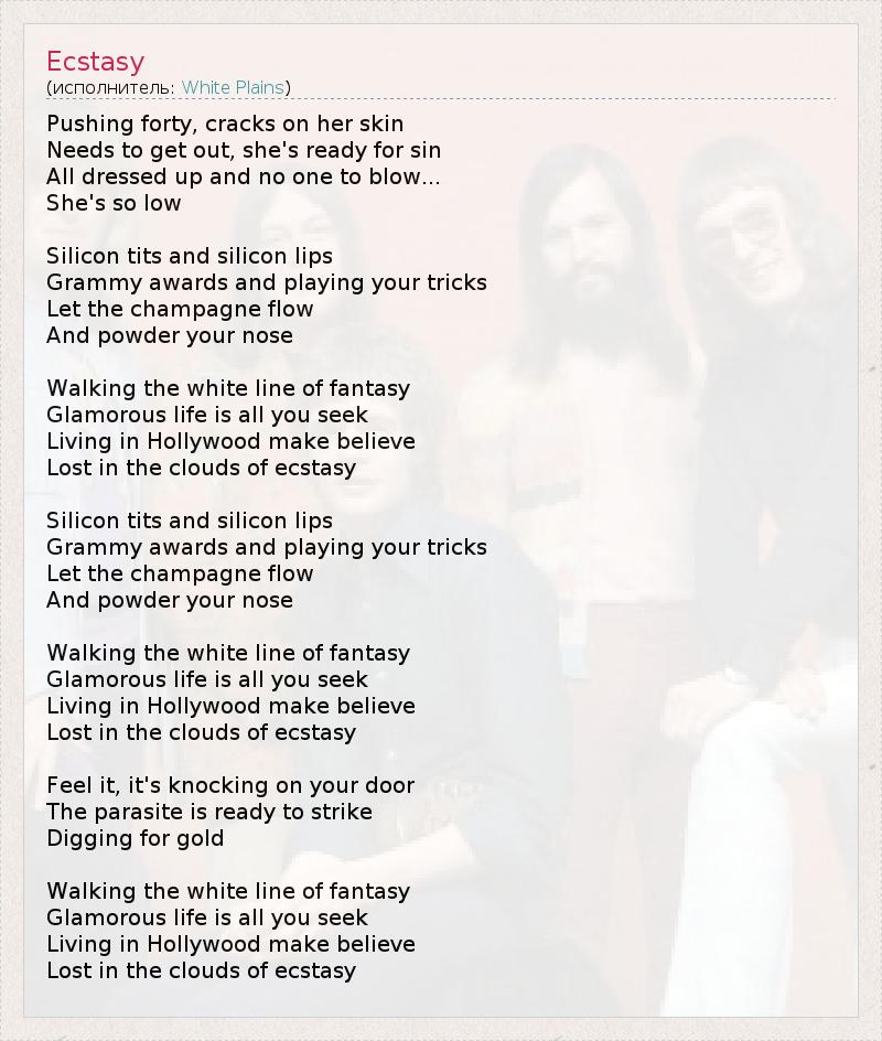 Скоро стукнет 40, трещины на ее коже, Ей нужно выбраться, она готова грешить, Наряжена, но не с кем развлечься... Она так подавлена. Грудь и губы – из силикона, Премии Грэмми и ловкий обман. Позволь шампанскому литься И припудри свой нос. Ходьба по белой полосе фантазии, Эффектная жизнь – все, что ты ищешь. Жизнь в Голливуде полна иллюзий, Потеряна в облаках безграничного восторга. Грудь и губы – из силикона, Премии Грэмми и ловкий обман. Позволь шампанскому литься и припудри свой нос. Ходьба по белой полосе фантазии, Эффектная жизнь – все, что ты ищешь. Жизнь в Голливуде полна иллюзий, Потеряна в облаках безграничного восторга. Почувствуй, он стучится в твою дверь, Паразит готов нанести удар, В поисках золота. Ходьба по белой полосе фантазии, Эффектная жизнь – все, что ты ищешь. Жизнь в Голливуде полна иллюзий, Потеряна в облаках безграничного восторга. * - также в контексте песни возможен перевод "В дурмане наркотиков" [прим. Амальгама]