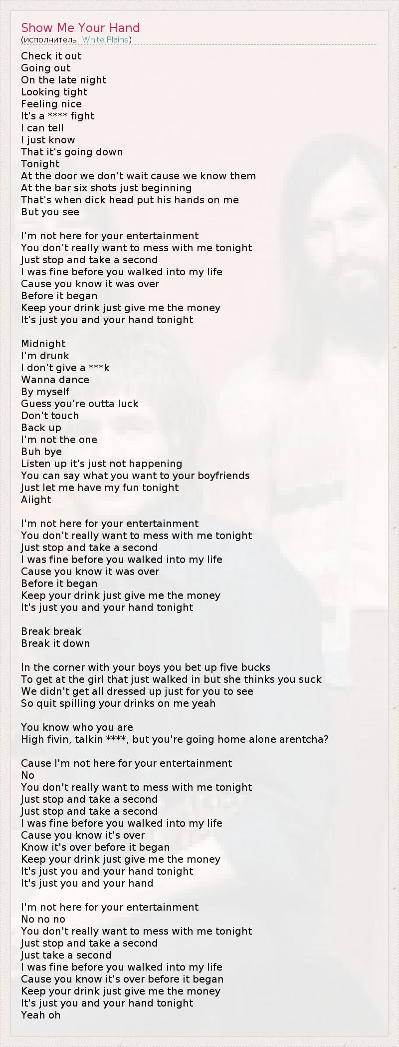 Check it out Going out On the late night Looking tight Feeling nice It's a **** fight I can tell I just know That it's going down Tonight At the door we don't wait cause we know them At the bar six shots just beginning That's when dick head put his hands on me But you see I'm not here for your entertainment You don't really want to mess with me tonight Just stop and take a second I was fine before you walked into my life Cause you know it was over Before it began Keep your drink just give me the money It's just you and your hand tonight Midnight I'm drunk I don't give a ***k Wanna dance By myself Guess you're outta luck Don't touch Back up I'm not the one Buh bye Listen up it's just not happening You can say what you want to your boyfriends Just let me have my fun tonight Aiight I'm not here for your entertainment You don't really want to mess with me tonight Just stop and take a second I was fine before you walked into my life Cause you know it was over Before it began Keep your drink just give me the money It's just you and your hand tonight Break break Break it down In the corner with your boys you bet up five bucks To get at the girl that just walked in but she thinks you suck We didn't get all dressed up just for you to see So quit spilling your drinks on me yeah You know who you are High fivin, talkin ****, but you're going home alone arentcha? Cause I'm not here for your entertainment No You don't really want to mess with me tonight Just stop and take a second Just stop and take a second I was fine before you walked into my life Cause you know it's over Know it's over before it began Keep your drink just give me the money It's just you and your hand tonight It's just you and your hand I'm not here for your entertainment No no no You don't really want to mess with me tonight Just stop and take a second Just take a second I was fine before you walked into my life Cause you know it's over before it began Keep your drink just give me the money It's just you and your hand tonight Yeah oh