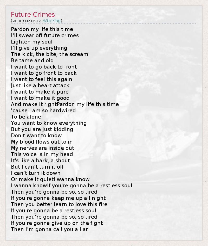 Pardon my life this time I'll swear off future crimes Lighten my soul I'll give up everything The kick, the bite, the scream Be tame and old I want to go back to front I want to go front to back I want to feel this again Just like a heart attack I want to make it pure I want to make it good And make it rightPardon my life this time 'cause I am so hardwired To be alone You want to know everything But you are just kidding Don't want to know My blood flows out to in My nerves are inside out This voice is in my head It's like a bark, a shout But I can't turn it off I can't turn it down Or make it quietI wanna know I wanna knowIf you're gonna be a restless soul Then you're gonna be so, so tired If you're gonna keep me up all night Then you better learn to love this fire If you're gonna be a restless soul Then you're gonna be so, so tired If you're gonna give up on the fight Then I'm gonna call you a liar