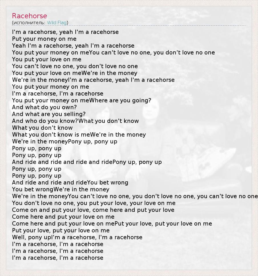 I'm a racehorse, yeah I'm a racehorse Put your money on me Yeah I'm a racehorse, yeah I'm a racehorse You put your money on meYou can't love no one, you don't love no one You put your love on me You can't love no one, you don't love no one You put your love on meWe're in the money We're in the moneyI'm a racehorse, yeah I'm a racehorse You put your money on me I'm a racehorse, I'm a racehorse You put your money on meWhere are you going? And what do you own? And what are you selling? And who do you know?What you don't know What you don't know What you don't know is meWe're in the money We're in the moneyPony up, pony up Pony up, pony up Pony up, pony up And ride and ride and ride and ridePony up, pony up Pony up, pony up Pony up, pony up And ride and ride and rideYou bet wrong You bet wrongWe're in the money We're in the moneyYou can't love no one, you don't love no one, you can't love no one You don't love no one, you put your love, your love on me Come on and put your love, come here and put your love Come here and put your love on me Come here and put your love on mePut your love, put your love on me Put your love, put your love on me Well, pony upI'm a racehorse, I'm a racehorse I'm a racehorse, I'm a racehorse I'm a racehorse, I'm a racehorse I'm a racehorse, I'm a racehorse