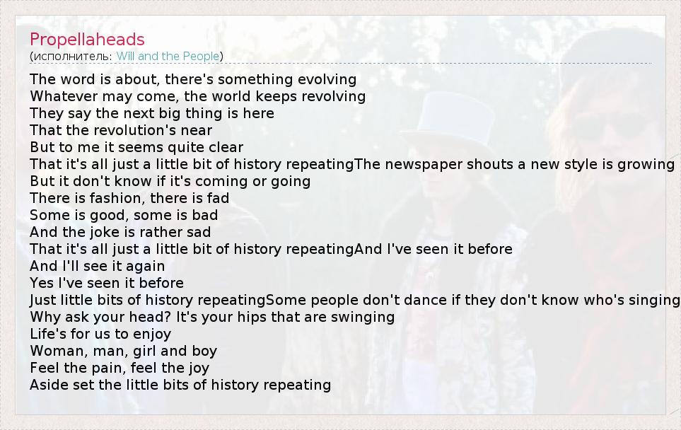 The word is about, there's something evolving Whatever may come, the world keeps revolving They say the next big thing is here That the revolution's near But to me it seems quite clear That it's all just a little bit of history repeatingThe newspaper shouts a new style is growing But it don't know if it's coming or going There is fashion, there is fad Some is good, some is bad And the joke is rather sad That it's all just a little bit of history repeatingAnd I've seen it before And I'll see it again Yes I've seen it before Just little bits of history repeatingSome people don't dance if they don't know who's singing Why ask your head? It's your hips that are swinging Life's for us to enjoy Woman, man, girl and boy Feel the pain, feel the joy Aside set the little bits of history repeating