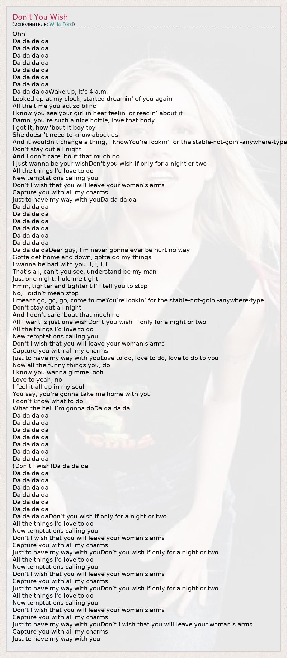 Ohh Da da da da Da da da da Da da da da Da da da da Da da da da Da da da da Da da da da Da da da daWake up, it's 4 a.m. Looked up at my clock, started dreamin' of you again All the time you act so blind I know you see your girl in heat feelin' or readin' about it Damn, you're such a nice hottie, love that body I got it, how 'bout it boy toy She doesn't need to know about us And it wouldn't change a thing, I knowYou're lookin' for the stable-not-goin'-anywhere-type Don't stay out all night And I don't care 'bout that much no I just wanna be your wishDon't you wish if only for a night or two All the things I'd love to do New temptations calling you Don't I wish that you will leave your woman's arms Capture you with all my charms Just to have my way with youDa da da da Da da da da Da da da da Da da da da Da da da da Da da da da Da da da da Da da da daDear guy, I'm never gonna ever be hurt no way Gotta get home and down, gotta do my things I wanna be bad with you, I, I, I, I That's all, can't you see, understand be my man Just one night, hold me tight Hmm, tighter and tighter til' I tell you to stop No, I didn't mean stop I meant go, go, go, come to meYou're lookin' for the stable-not-goin'-anywhere-type Don't stay out all night And I don't care 'bout that much no All I want is just one wishDon't you wish if only for a night or two All the things I'd love to do New temptations calling you Don't I wish that you will leave your woman's arms Capture you with all my charms Just to have my way with youLove to do, love to do, love to do to you Now all the funny things you, do I know you wanna gimme, ooh Love to yeah, no I feel it all up in my soul You say, you're gonna take me home with you I don't know what to do What the hell I'm gonna doDa da da da Da da da da Da da da da Da da da da Da da da da Da da da da Da da da da Da da da da (Don't I wish)Da da da da Da da da da Da da da da Da da da da Da da da da Da da da da Da da da da Da da da daDon't you wish if only for a night or two All the things I'd love to do New temptations calling you Don't I wish that you will leave your woman's arms Capture you with all my charms Just to have my way with youDon't you wish if only for a night or two All the things I'd love to do New temptations calling you Don't I wish that you will leave your woman's arms Capture you with all my charms Just to have my way with youDon't you wish if only for a night or two All the things I'd love to do New temptations calling you Don't I wish that you will leave your woman's arms Capture you with all my charms Just to have my way with youDon't I wish that you will leave your woman's arms Capture you with all my charms Just to have my way with you