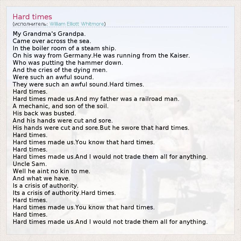 My Grandma's Grandpa. Came over across the sea. In the boiler room of a steam ship. On his way from Germany.He was running from the Kaiser. Who was putting the hammer down. And the cries of the dying men. Were such an awful sound. They were such an awful sound.Hard times. Hard times. Hard times made us.And my father was a railroad man. A mechanic, and son of the soil. His back was busted. And his hands were cut and sore. His hands were cut and sore.But he swore that hard times. Hard times. Hard times made us.You know that hard times. Hard times. Hard times made us.And I would not trade them all for anything. Uncle Sam. Well he aint no kin to me. And what we have. Is a crisis of authority. Its a crisis of authority.Hard times. Hard times. Hard times made us.You know that hard times. Hard times. Hard times made us.And I would not trade them all for anything.
