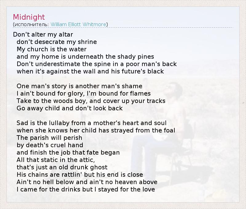 Don't alter my altar don't desecrate my shrine My church is the water and my home is underneath the shady pines Don't underestimate the spine in a poor man's back when it's against the wall and his future's black One man's story is another man's shame I ain't bound for glory, I'm bound for flames Take to the woods boy, and cover up your tracks Go away child and don't look back Sad is the lullaby from a mother's heart and soul when she knows her child has strayed from the foal The parish will perish by death's cruel hand and finish the job that fate began All that static in the attic, that's just an old drunk ghost His chains are rattlin' but his end is close Ain't no hell below and ain't no heaven above I came for the drinks but I stayed for the love