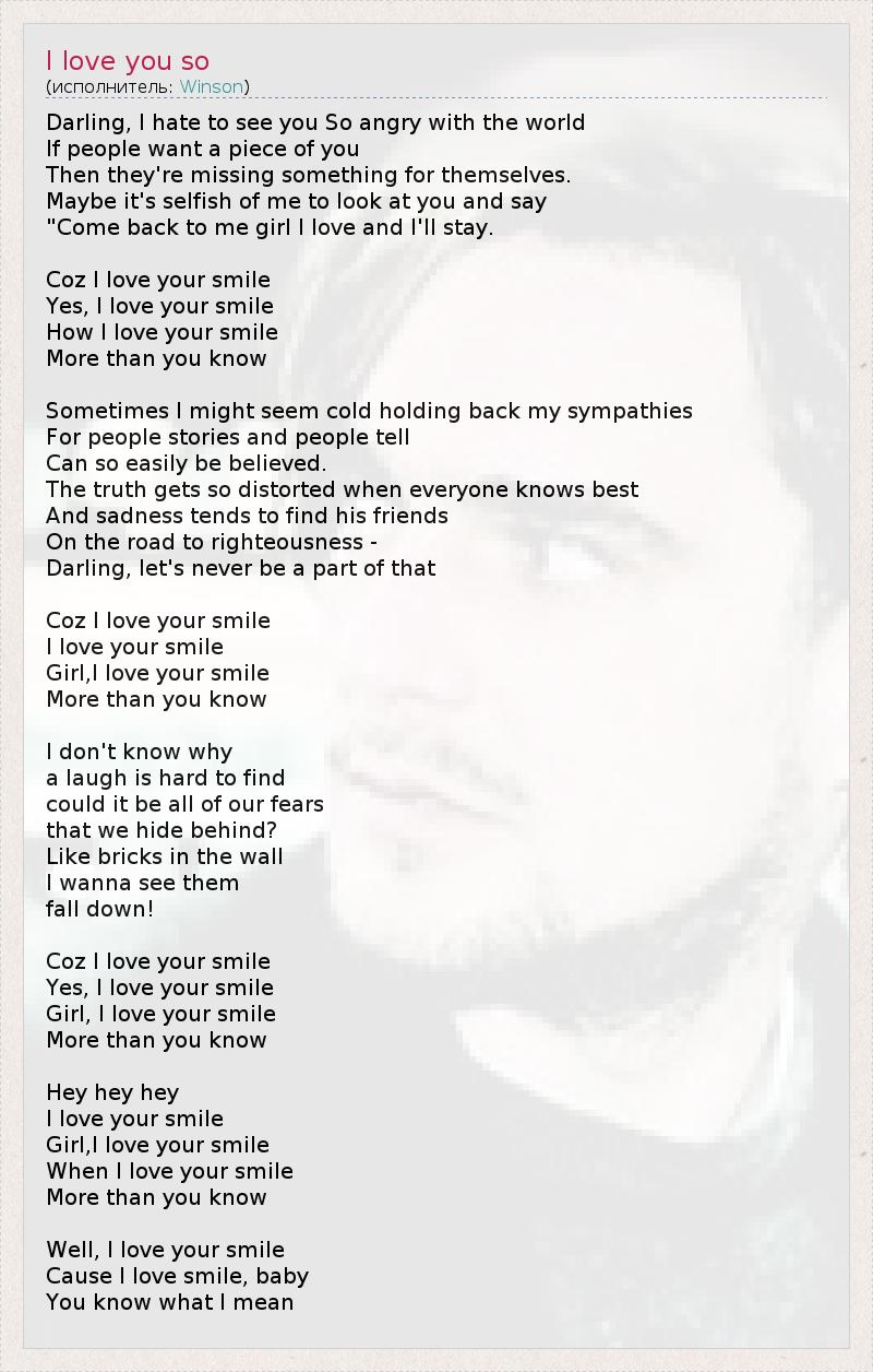 Darling, I hate to see you So angry with the world If people want a piece of you Then they're missing something for themselves. Maybe it's selfish of me to look at you and say "Come back to me girl I love and I'll stay. Coz I love your smile Yes, I love your smile How I love your smile More than you know Sometimes I might seem cold holding back my sympathies For people stories and people tell Can so easily be believed. The truth gets so distorted when everyone knows best And sadness tends to find his friends On the road to righteousness - Darling, let's never be a part of that Coz I love your smile I love your smile Girl,I love your smile More than you know I don't know why a laugh is hard to find could it be all of our fears that we hide behind? Like bricks in the wall I wanna see them fall down! Coz I love your smile Yes, I love your smile Girl, I love your smile More than you know Hey hey hey I love your smile Girl,I love your smile When I love your smile More than you know Well, I love your smile Cause I love smile, baby You know what I mean