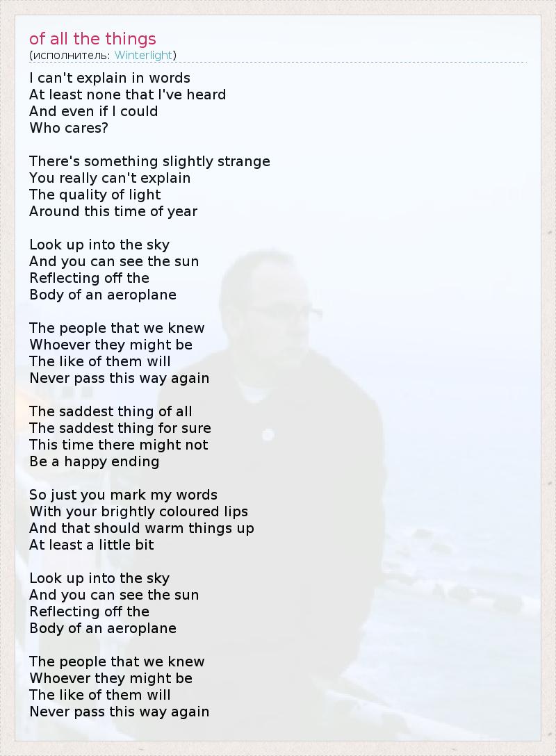 Не могу объяснить словами По крайней мере, известными мне И даже, если б мог Кого это волнует? Нечто неуловимо удивительное И в самом деле, ты не сможешь объяснить Почему свет такой особенный В это время года Посмотри в небо И ты увидишь Солнце, Оно отражается На фюзеляже самолёта Люди, которых мы знали Кем бы они ни были Такие как они Никогда не пройдут этот путь снова Самое печальное, что могло быть Определённо, самое печальное – В этот раз не могло быть Счастливого конца Итак, ты просто отмечаешь мои слова Ярко накрашенными губами И это должно оживить обстановку Хотя бы немного Посмотри в небо И ты увидишь Солнце, Оно отражается На фюзеляже самолёта Люди, которых мы знали Кем бы они ни были Такие как они Никогда не пройдут этот путь снова (c)The Most Known