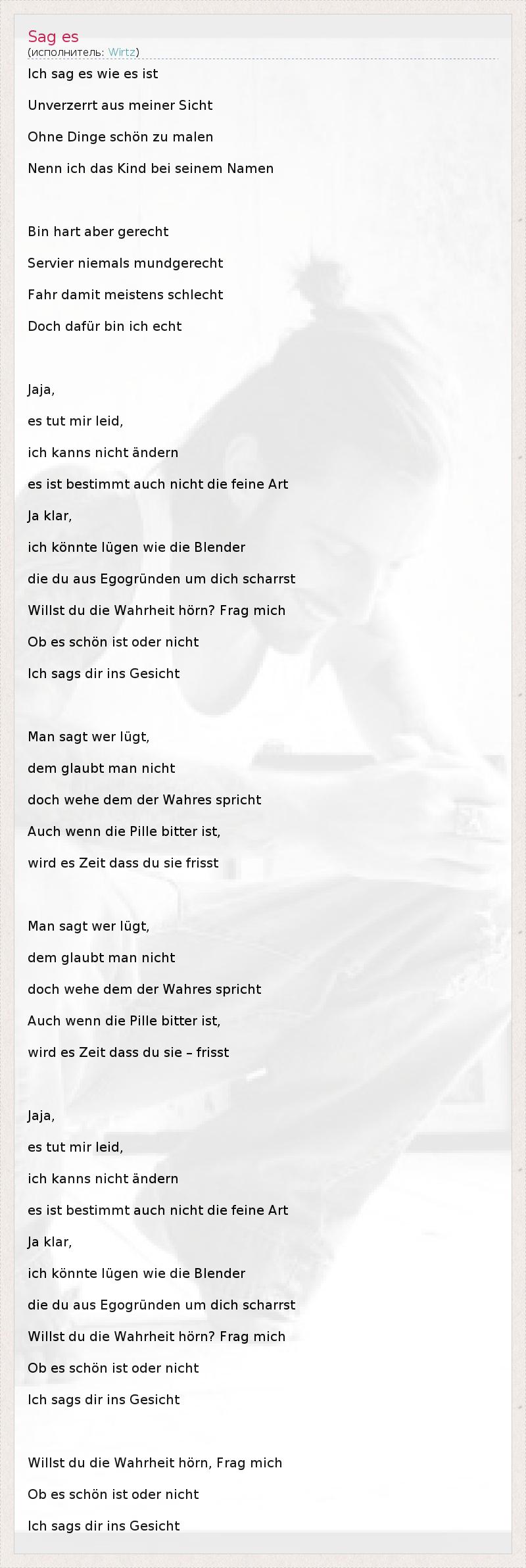 Ich sag es wie es ist Unverzerrt aus meiner Sicht Ohne Dinge schön zu malen Nenn ich das Kind bei seinem Namen Bin hart aber gerecht Servier niemals mundgerecht Fahr damit meistens schlecht Doch dafür bin ich echt Jaja, es tut mir leid, ich kanns nicht ändern es ist bestimmt auch nicht die feine Art Ja klar, ich könnte lügen wie die Blender die du aus Egogründen um dich scharrst Willst du die Wahrheit hörn? Frag mich Ob es schön ist oder nicht Ich sags dir ins Gesicht Man sagt wer lügt, dem glaubt man nicht doch wehe dem der Wahres spricht Auch wenn die Pille bitter ist, wird es Zeit dass du sie frisst Man sagt wer lügt, dem glaubt man nicht doch wehe dem der Wahres spricht Auch wenn die Pille bitter ist, wird es Zeit dass du sie – frisst Jaja, es tut mir leid, ich kanns nicht ändern es ist bestimmt auch nicht die feine Art Ja klar, ich könnte lügen wie die Blender die du aus Egogründen um dich scharrst Willst du die Wahrheit hörn? Frag mich Ob es schön ist oder nicht Ich sags dir ins Gesicht Willst du die Wahrheit hörn, Frag mich Ob es schön ist oder nicht Ich sags dir ins Gesicht