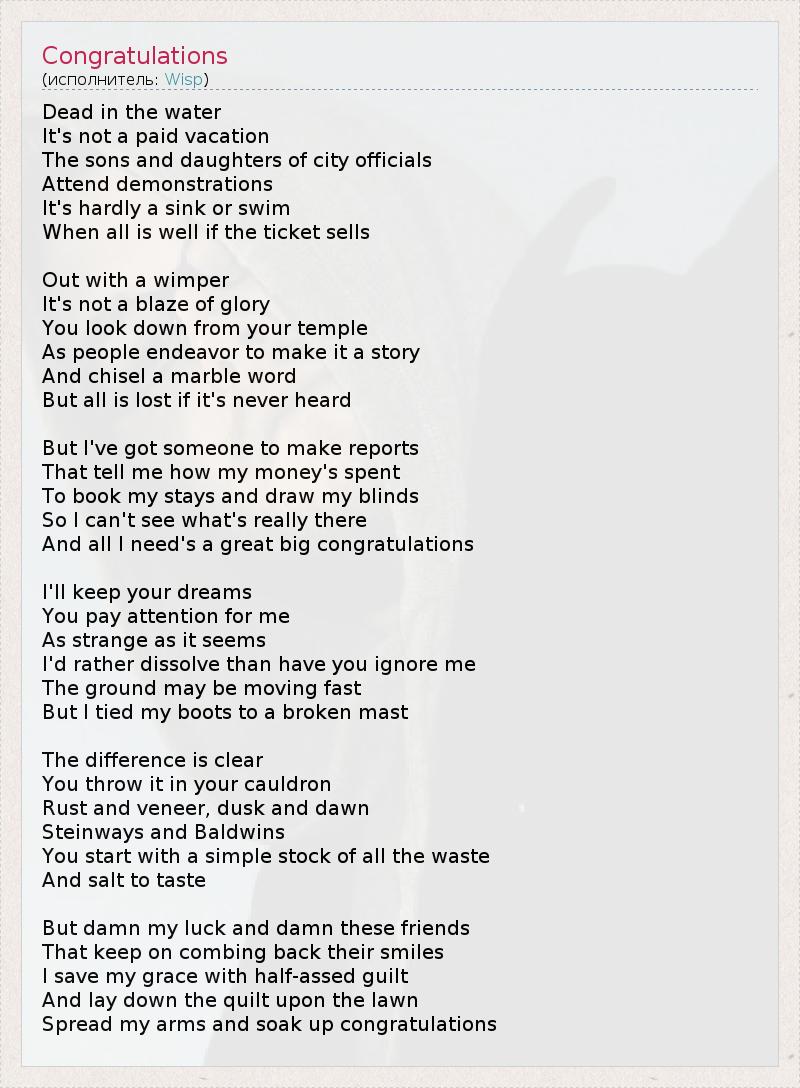 Dead in the water It's not a paid vacation The sons and daughters of city officials Attend demonstrations It's hardly a sink or swim When all is well if the ticket sells Out with a wimper It's not a blaze of glory You look down from your temple As people endeavor to make it a story And chisel a marble word But all is lost if it's never heard But I've got someone to make reports That tell me how my money's spent To book my stays and draw my blinds So I can't see what's really there And all I need's a great big congratulations I'll keep your dreams You pay attention for me As strange as it seems I'd rather dissolve than have you ignore me The ground may be moving fast But I tied my boots to a broken mast The difference is clear You throw it in your cauldron Rust and veneer, dusk and dawn Steinways and Baldwins You start with a simple stock of all the waste And salt to taste But damn my luck and damn these friends That keep on combing back their smiles I save my grace with half-assed guilt And lay down the quilt upon the lawn Spread my arms and soak up congratulations