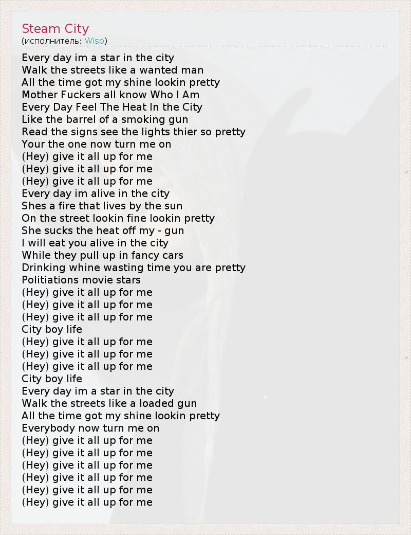 Every day im a star in the city Walk the streets like a wanted man All the time got my shine lookin pretty Mother Fuckers all know Who I Am Every Day Feel The Heat In the City Like the barrel of a smoking gun Read the signs see the lights thier so pretty Your the one now turn me on (Hey) give it all up for me (Hey) give it all up for me (Hey) give it all up for me Every day im alive in the city Shes a fire that lives by the sun On the street lookin fine lookin pretty She sucks the heat off my - gun I will eat you alive in the city While they pull up in fancy cars Drinking whine wasting time you are pretty Politiations movie stars (Hey) give it all up for me (Hey) give it all up for me (Hey) give it all up for me City boy life (Hey) give it all up for me (Hey) give it all up for me (Hey) give it all up for me City boy life Every day im a star in the city Walk the streets like a loaded gun All the time got my shine lookin pretty Everybody now turn me on (Hey) give it all up for me (Hey) give it all up for me (Hey) give it all up for me (Hey) give it all up for me (Hey) give it all up for me (Hey) give it all up for me