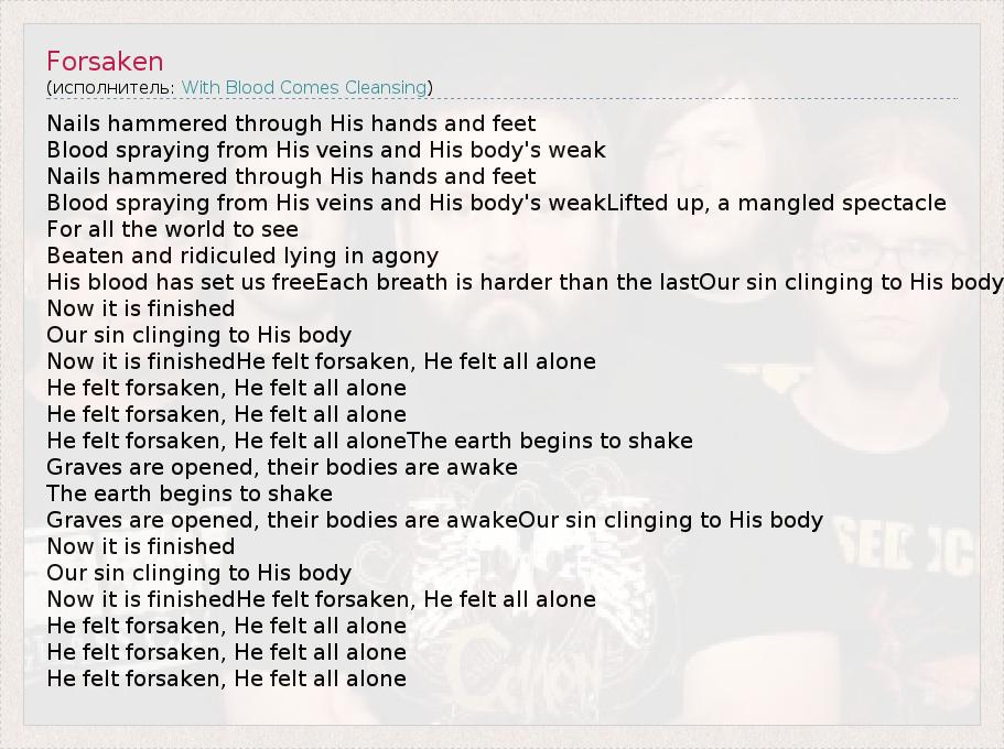 Nails hammered through His hands and feet Blood spraying from His veins and His body's weak Nails hammered through His hands and feet Blood spraying from His veins and His body's weakLifted up, a mangled spectacle For all the world to see Beaten and ridiculed lying in agony His blood has set us freeEach breath is harder than the lastOur sin clinging to His body Now it is finished Our sin clinging to His body Now it is finishedHe felt forsaken, He felt all alone He felt forsaken, He felt all alone He felt forsaken, He felt all alone He felt forsaken, He felt all aloneThe earth begins to shake Graves are opened, their bodies are awake The earth begins to shake Graves are opened, their bodies are awakeOur sin clinging to His body Now it is finished Our sin clinging to His body Now it is finishedHe felt forsaken, He felt all alone He felt forsaken, He felt all alone He felt forsaken, He felt all alone He felt forsaken, He felt all alone