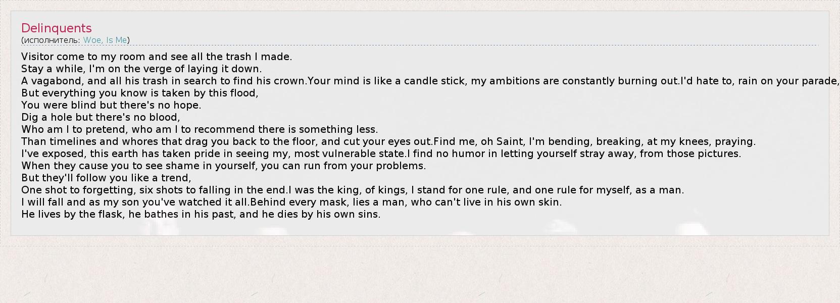 A vagabond, and all his trash in search to find his crown.Your mind is like a candle stick, my ambitions are constantly burning out.I'd hate to, rain on your parade,